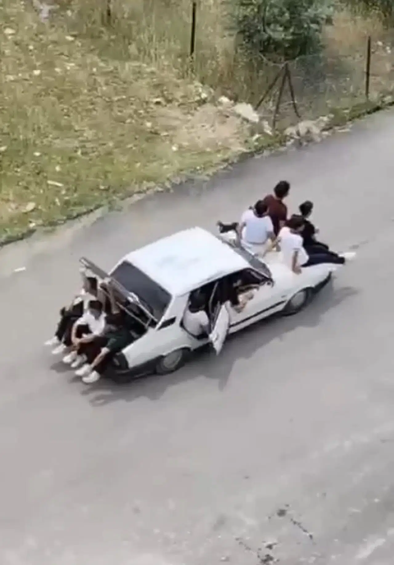 Yüreğir ilçesi Özgür Mahallesi'nin ara sokaklarında bagajında ve kaputunda çok sayıda çocuğun yolculuk yaptığı otomobil dikkat çekti. Tıka basa dolu otomobilin içindeki çocuklardan bazıları da açık kapılardan sarktı. Tehlikeli yolculuk, çevredekilerce cep telefonuyla görüntülendi. Tehlikeye aldırış etmeyen sürücü, sokaklarda ilerleyerek gözden kayboldu. (DHA)