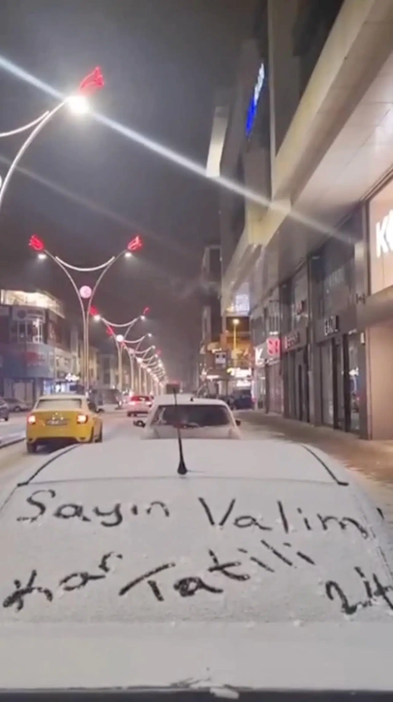 Erzincan'da hafta sonu yaşanan kar yağışı kenti beyaza bürüdü. Kar kalınlığının 2 santimetreyi geçtiği kent merkezinde bazı öğrenciler, park halindeki bir otomobilin arka camına 'Sayın Valim kar tatili' yazarak, bunun fotoğraflarını Vali’nin sosyal medya hesabına gönderdi. Öğrencilerin bu talebine Vali Hamza Aydoğdu, aynı yöntemle cevap verdi. Park halindeki bir otomobilin camına çocuk resmi çizen Vali Aydoğdu, 'Tatil yok okula devam' yazdı. Aydoğdu, sosyal medya hesabından yaptığı paylaşımda da “Sevgili gençler, sevginiz tarif edilemez ama her kar yağışı tatil getirmez, okullar açık. Hadi şimdi ders ziliyle buluşma vakti" mesajını paylaştı. Vali Aydoğdu, öğrencilerin yazısıyla kendi cevabını sosyal medya hesabından paylaştı. (DHA)