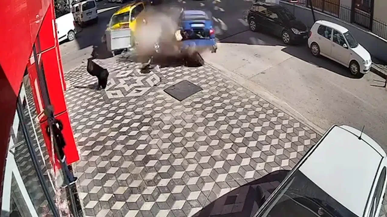 Kaza anı bir iş yerinin güvenlik kamerasına yansıdı. Görüntülerde otomobil ile taksinin kavşakta çarpıştığı, kontrolden çıkan otomobilin park halindeki başka otomobile çarptığı anlar yer aldı. (DHA)