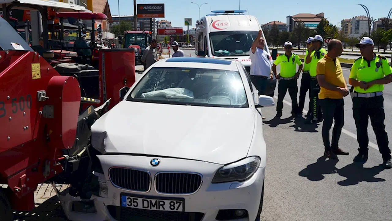 Otomobil traktör bayisine girdi; sürücü, ‘uykum vardı, mola vermeyince kaza yaptık’ dedi