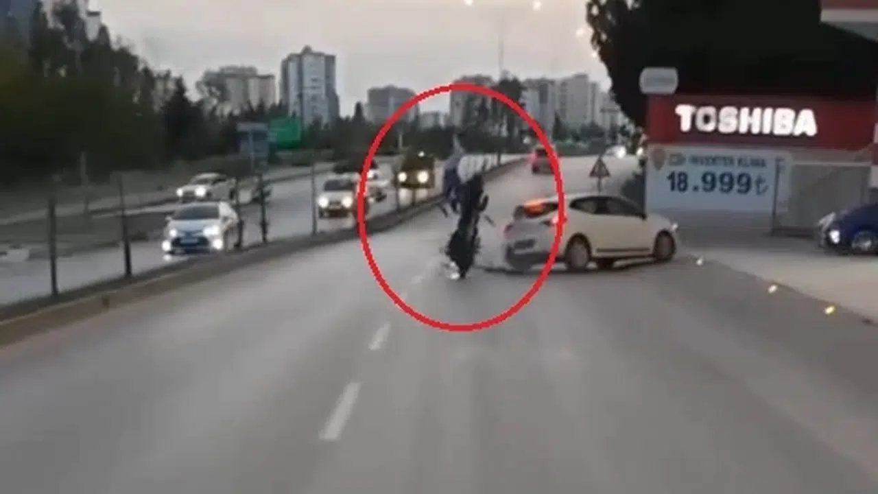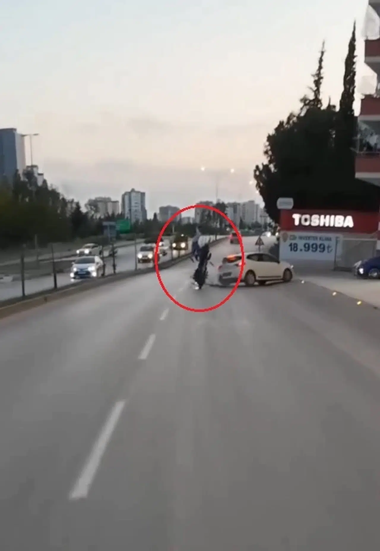 Serhat GÜLER/ADANA,(DHA)- ADANA'da dönüş yapan otomobile arkadan çarpan motosiklet sürücüsü havada takla atıp düşerek yaralandı. Kaza anı başka bir motosiklet sürücüsünün kask kamerasına yansıdı.