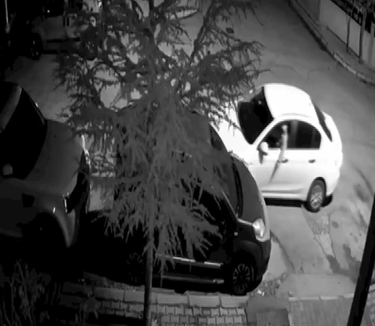 Güvenlik kamerası kayıtlarında beyaz bir otomobille yavaşlayan sürücünün elini camdan çıkarıp, sert bir cisimle park halindeki otomobilleri çizerek olay yerinden ayrılması yer aldı. (DHA)
