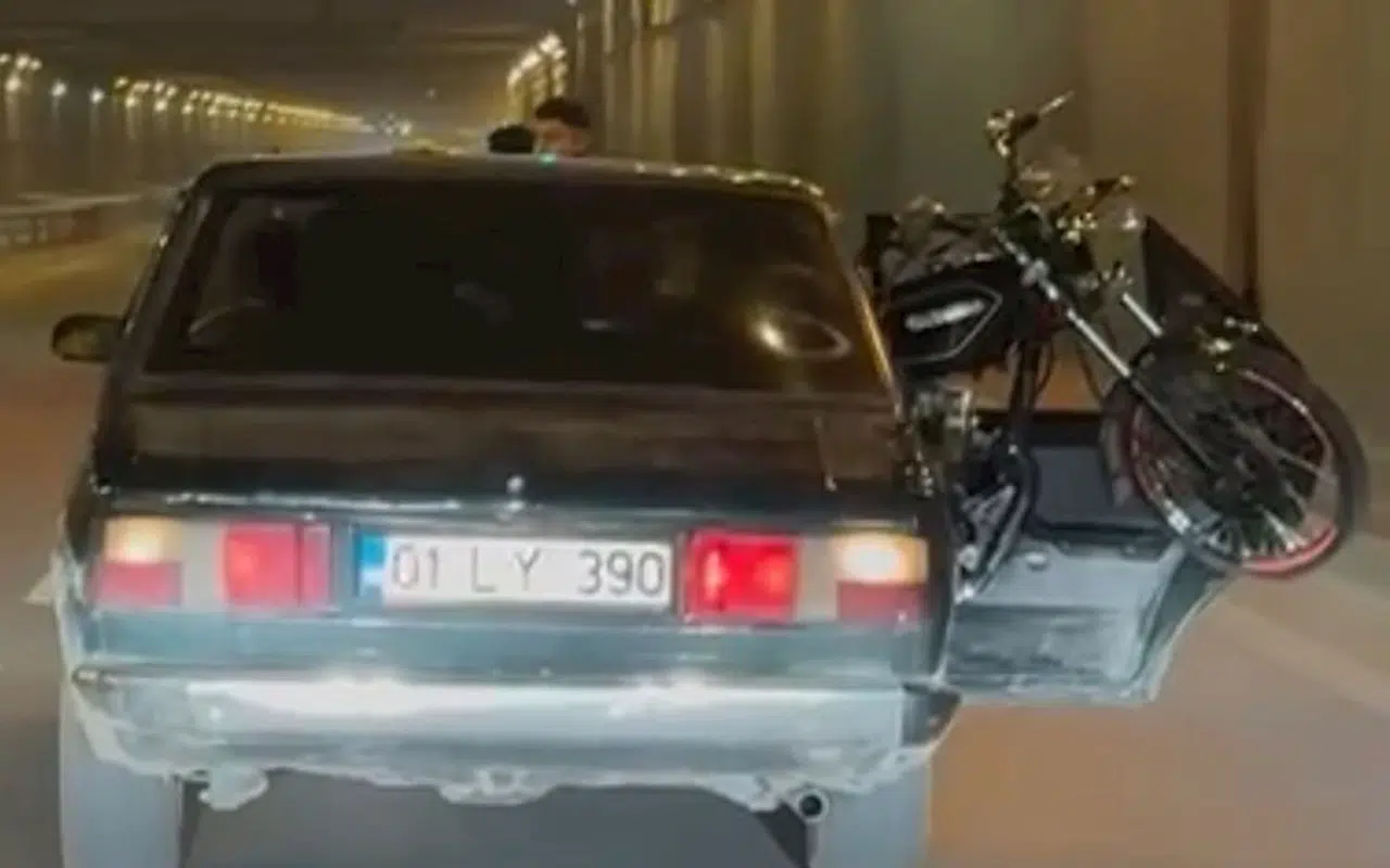 Seyhan ilçesi Turhan Cemal Beriker Bulvarı'nda ilerleyen 01 LY 390 plakalı otomobilin arka koltuğunda motosiklet taşıyan sürücü, trafik güvenliğini tehlikeye attı. Arka kapısı açık otomobilde motosikletin yarısı dışarıdayken ilerleyen sürücü, çevredekilerin uyarılarına aldırış etmedi. Tehlikeli yolculuğu cep telefonuyla görüntüleyen trafikteki diğer kişiler, durumu 112 Acil Çağrı Merkezi'ne bildirdi. İhbar üzerine çalışma başlatan Trafik Denetleme Şube Müdürlüğü ekipleri, 'trafiğin güvenliğini düzenleyen diğer hususlara uymadığı' gerekçesiyle sürücüye 993 lira para cezası uyguladı. (DHA)