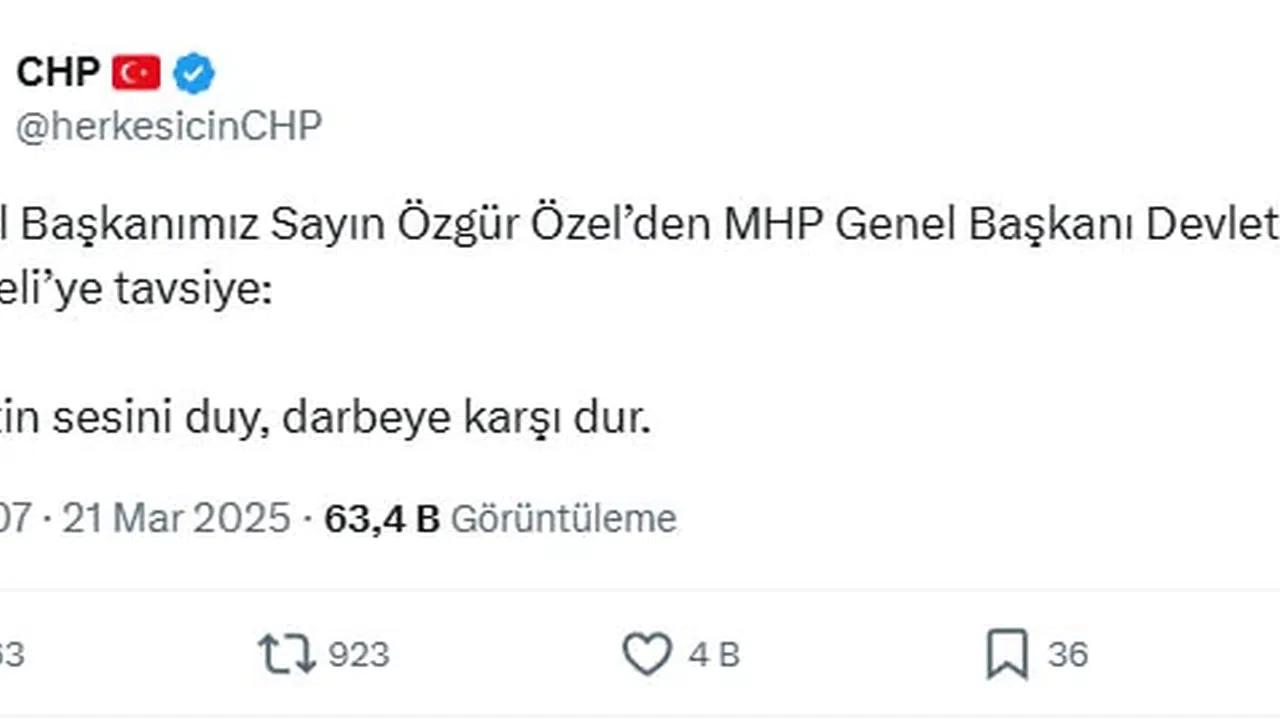 MHP'nin paylaşımı sonrası CHP'den de açıklama geldi. CHP'nin sosyal medya hesabından yapılan paylaşımda, "Genel Başkanımız Sayın Özgür Özel'den MHP Genel Başkanı Devlet Bahçeli'ye tavsiye; Milletin sesini duy, darbeye karşı dur" ifadeleri kullanıldı. (DHA)