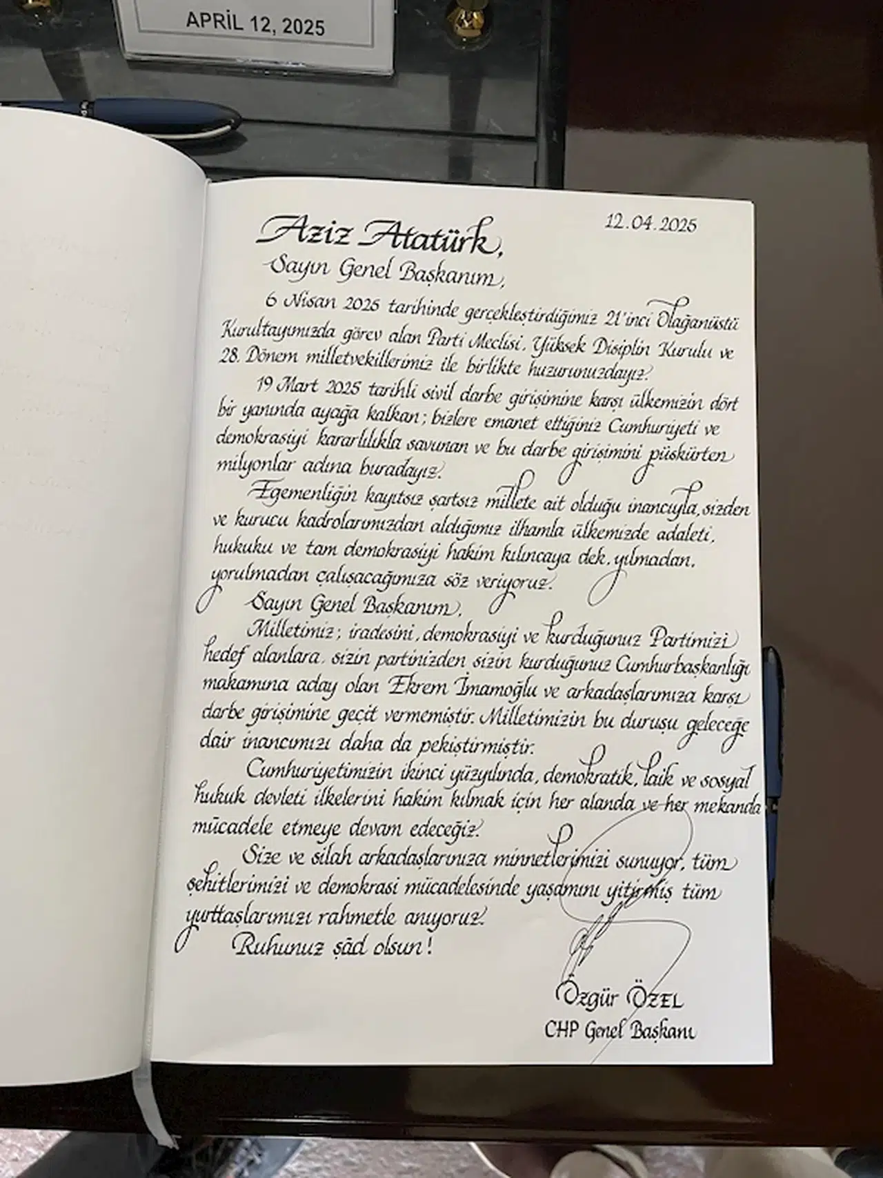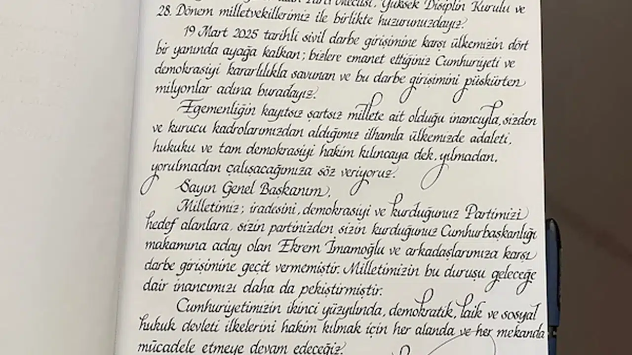 "19 Mart 2025 tarihli sivil darbe girişimine karşı ülkemizin dört bir yanında ayağa kalkan; bizlere emanet ettiğiniz Cumhuriyeti ve demokrasiyi kararlılıkla savunan ve bu darbe girişimini püskürten milyonlar adına buradayız. Egemenliğin kayıtsız şartsız millete ait olduğu inancıyla, sizden ve kurucu kadrolarımızdan aldığımız ilhamla ülkemizde adaleti, hukuku ve tam demokrasiyi hakim kılıncaya dek, yılmadan, yorulmadan çalışacağımıza söz veriyoruz. Sayın Genel Başkanım, milletimiz; iradesini, demokrasiyi ve kurduğunuz partimizi hedef alanlara, sizin partinizden, sizin kurduğunuz Cumhurbaşkanlığı makamına aday olan Ekrem İmamoğlu ve arkadaşlarımıza karşı darbe girişimine geçit vermemiştir. Milletimizin bu duruşu, geleceğe dair inancımızı daha da pekiştirmiştir. Demokratik, laik ve sosyal cumhuriyetimizin ikinci yüzyılında, demokratik, hukuk devleti ilkelerini hakim kılmak için her alanda ve her mekanda mücadele etmeye devam edeceğiz."