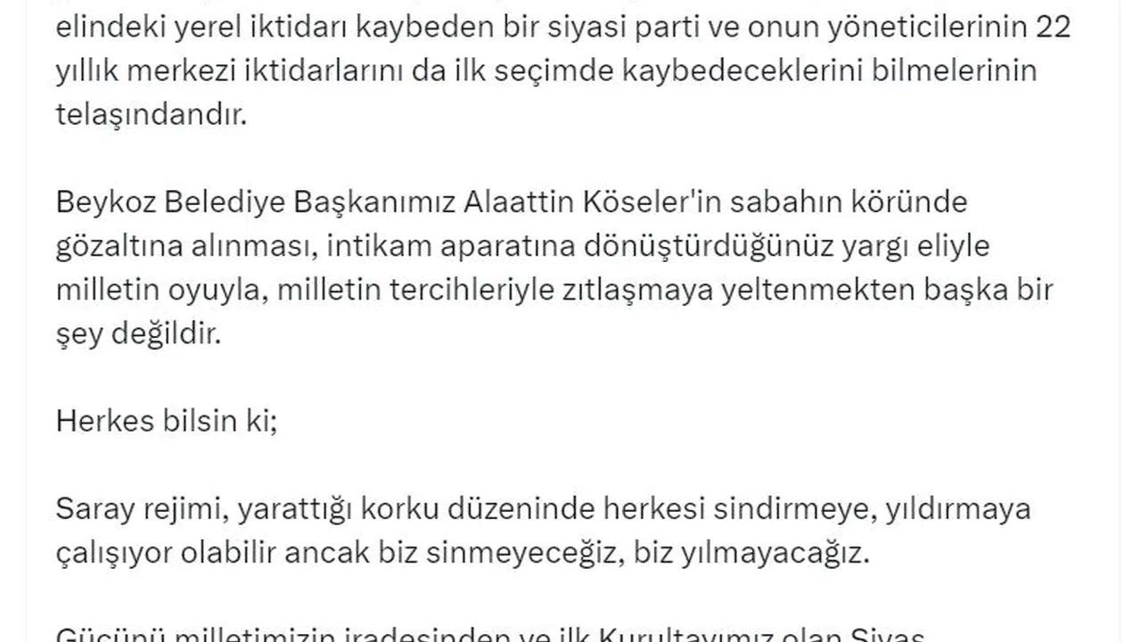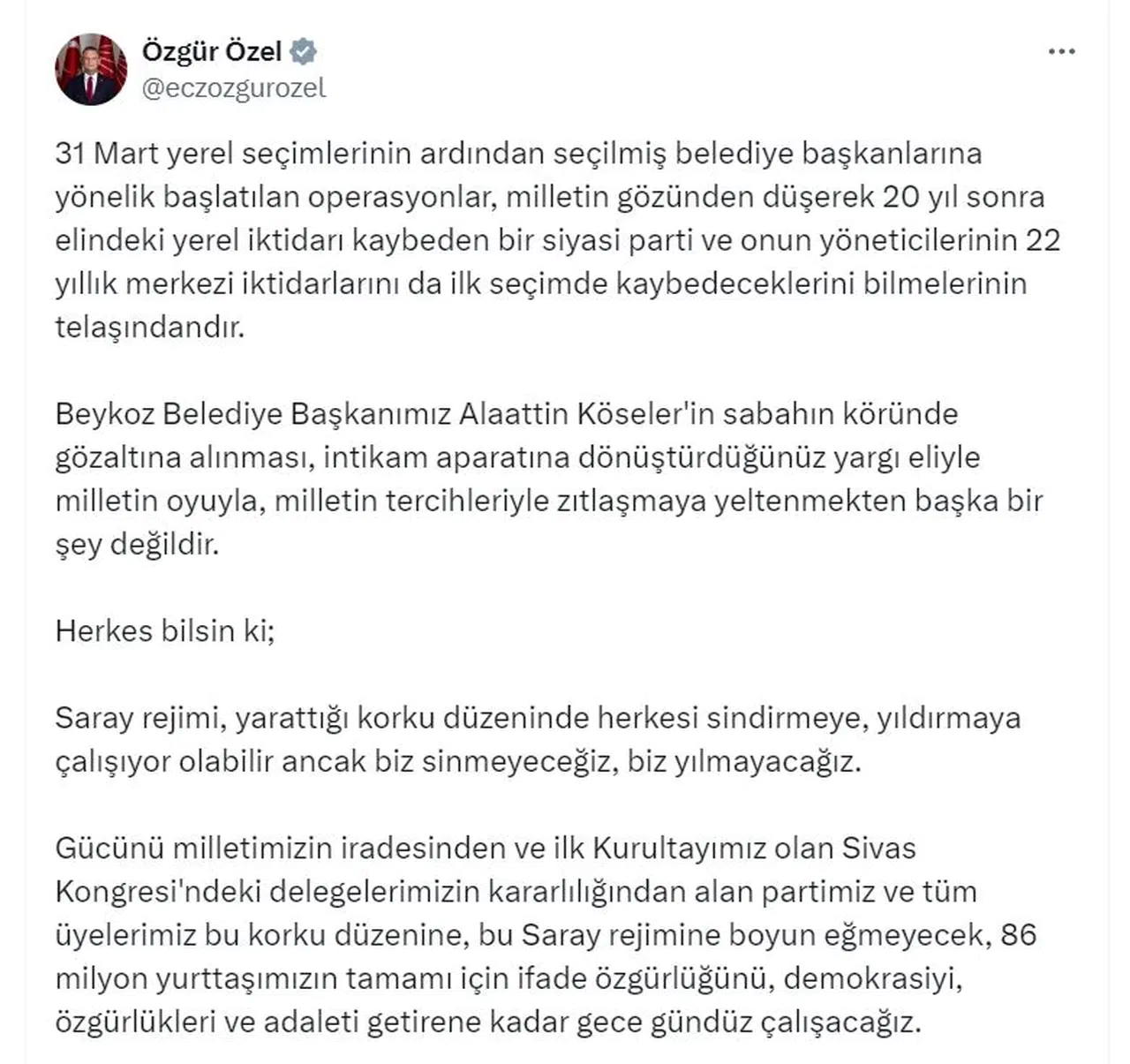 ANKARA, (DHA)- CHP Genel Başkanı Özgür Özel, "Beykoz Belediye Başkanımız Alaattin Köseler'in sabahın köründe gözaltına alınması, intikam aparatına dönüştürdüğünüz yargı eliyle milletin oyuyla, milletin tercihleriyle zıtlaşmaya yeltenmekten başka bir şey değildir" dedi.