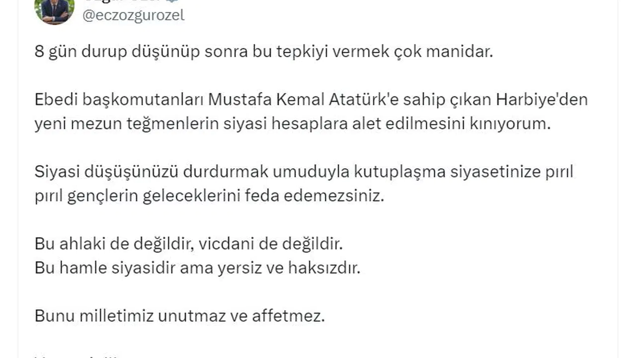 Özel, sosyal medya hesabından yaptığı açıklamada, "8 gün durup düşünüp sonra bu tepkiyi vermek çok manidar. Ebedi başkomutanları Mustafa Kemal Atatürk'e sahip çıkan Harbiye'den yeni mezun teğmenlerin siyasi hesaplara alet edilmesini kınıyorum. Siyasi düşüşünüzü durdurmak umuduyla kutuplaşma siyasetinize pırıl pırıl gençlerin geleceklerini feda edemezsiniz. Bu ahlaki de değildir, vicdani de değildir. Bu hamle siyasidir ama yersiz ve haksızdır. Bunu milletimiz unutmaz ve affetmez. Vazgeçin" dedi. (DHA)