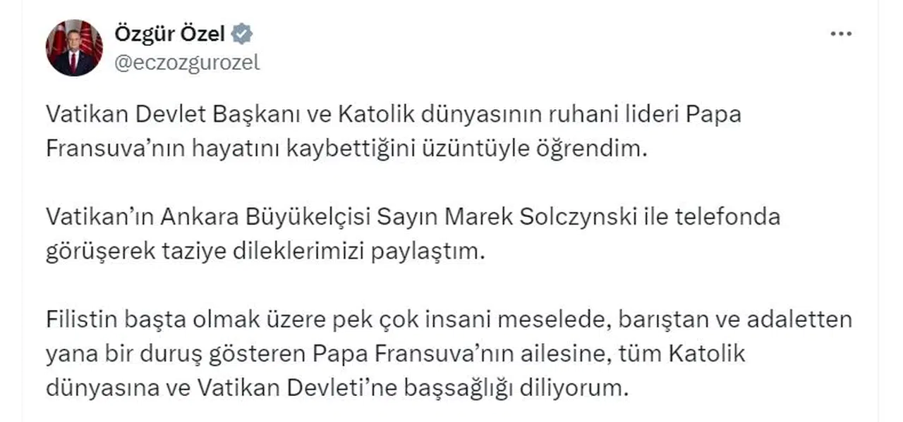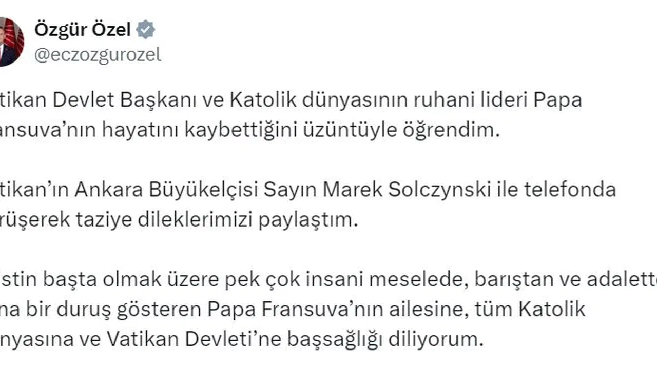 ANKARA, (DHA)- CHP Genel Başkanı Özgür Özel, Vatikan Devlet Başkanı Papa Fransuva'nın yaşamını yitirmesi nedeniyle taziye mesajı paylaştı.