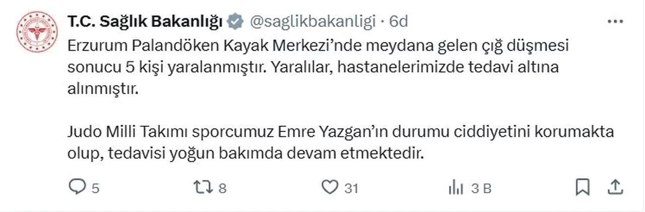 Sağlık Bakanlığı, Erzurum'da yaşanan çığ olayına ilişkin açıklama yaptı. Bakanlıktan yapılan açıklamada "Erzurum Palandöken Kayak Merkezi’nde meydana gelen çığ düşmesi sonucu 5 kişi yaralanmıştır. Yaralılar, hastanelerimizde tedavi altına alınmıştır. Judo Milli Takımı sporcumuz Emre Yazgan’ın durumu ciddiyetini korumakta olup, tedavisi yoğun bakımda devam etmektedir" denildi. (DHA)