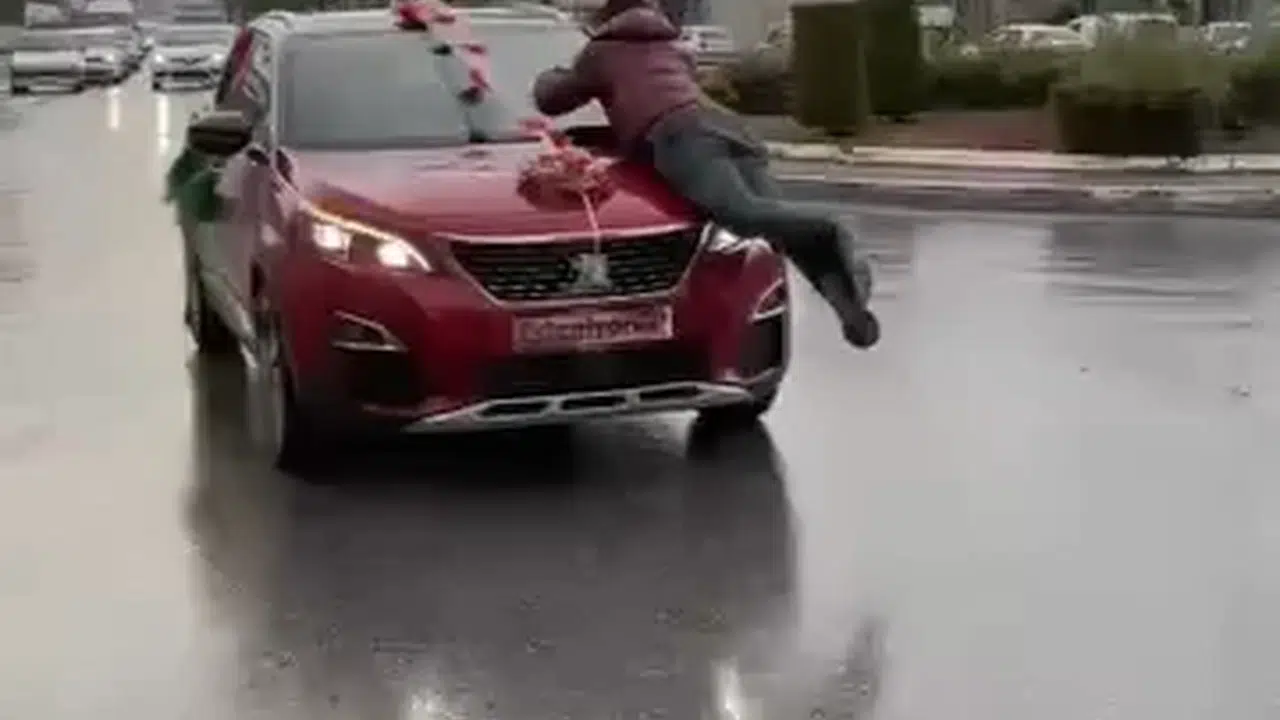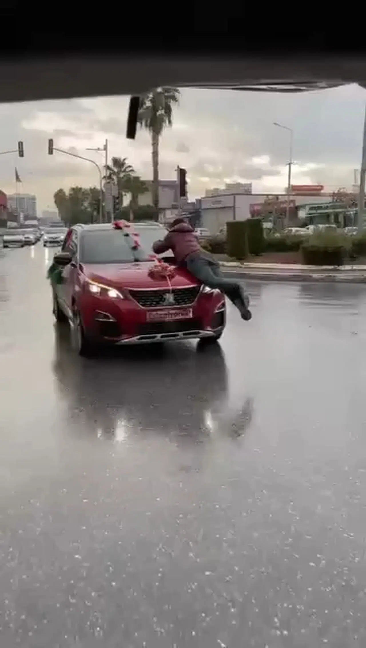 ADANA, (DHA)- ADANA'da para istemek için gelin arabasının kaputuna çıkıp, seyir halindeki araca tutunan kişiye, damat ve yakınları tarafından meydan dayağı atıldı. Bu anlar, bir vatandaş tarafından cep telefonu kamerası ile anbean kaydedildi.