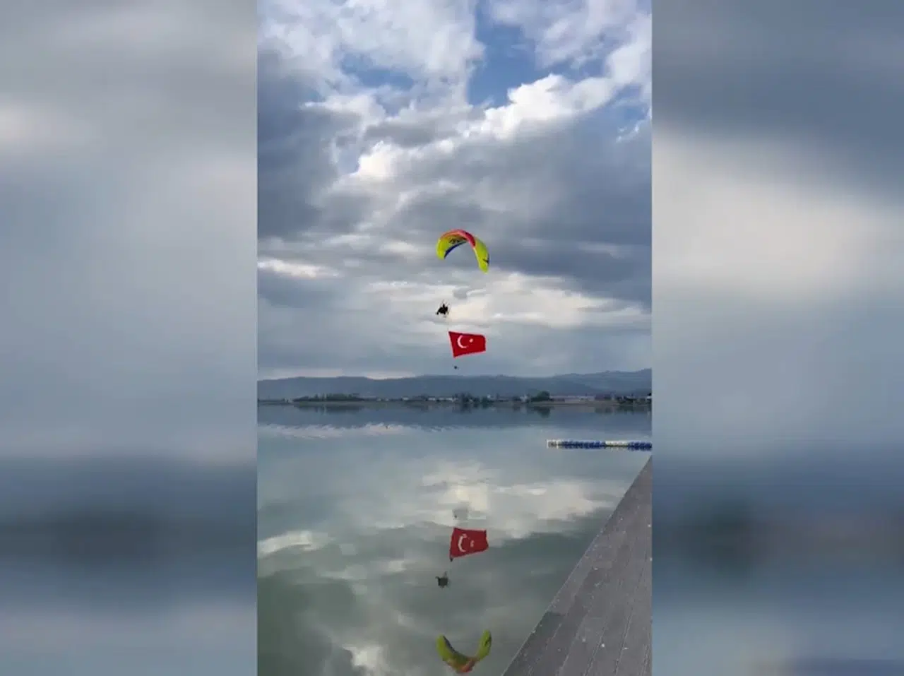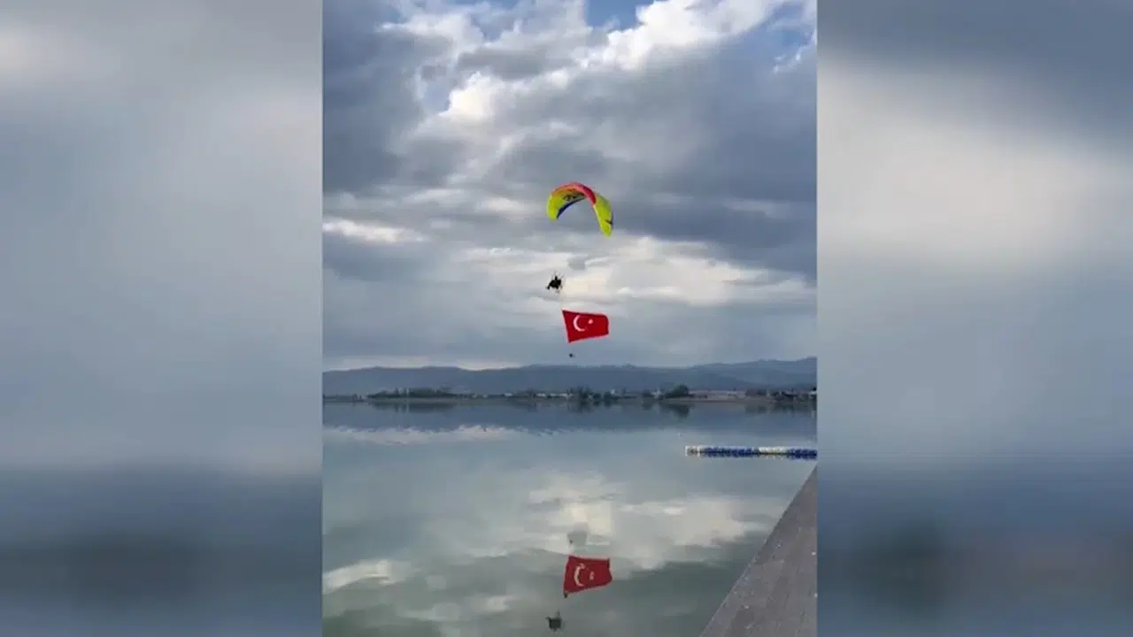 Tarihi ve doğal güzellikleriyle ünlü İznik ilçesi, coğrafi şartlarıyla da birçok hava gösterisine ev sahipliği yapıyor. Türkiye'nin 5'inci, Marmara Bölgesi’nin en büyük doğal gölü olan İznik Gölü’nün semaları, bu kez Türk bayrağı ile gösteri uçuşu gerçekleştiren Türk Hava Kurumu’nun paramotor ekibini ağırladı. Uluslararası yarışmalara hazırlanmak için Bursa’ya gelen Katar paramotor ekibine lojistik destek sağlayan Türk Hava Kurumu’nun paramotor ekibi, İznik Gölü üzerinde gösteri uçuşu gerçekleştirdi. THK gösteri pilotu ve yamaç paraşütü öğretmeni Ömer Faruk Karaoğlan, taşıdığı dev Türk bayrağıyla göl ve tarihi surlar üzerinde uçtu. Güneş batarken gerçekleşen gösteride hüzme oluştu ve bayrağın suya yansıması dikkat çekti.