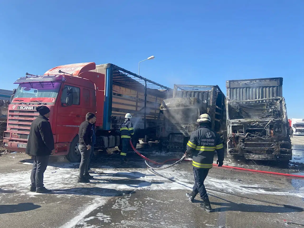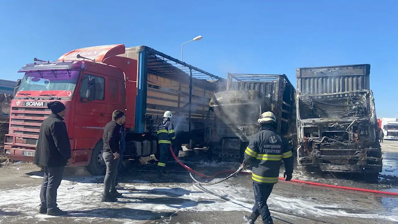 Batuhan KILIÇ/ESKİŞEHİR,(DHA)- ESKİŞEHİR'de park halindeki 3 TIR alev aldı. Yangın, itfaiyecilerin müdahalesiyle söndürüldü.
