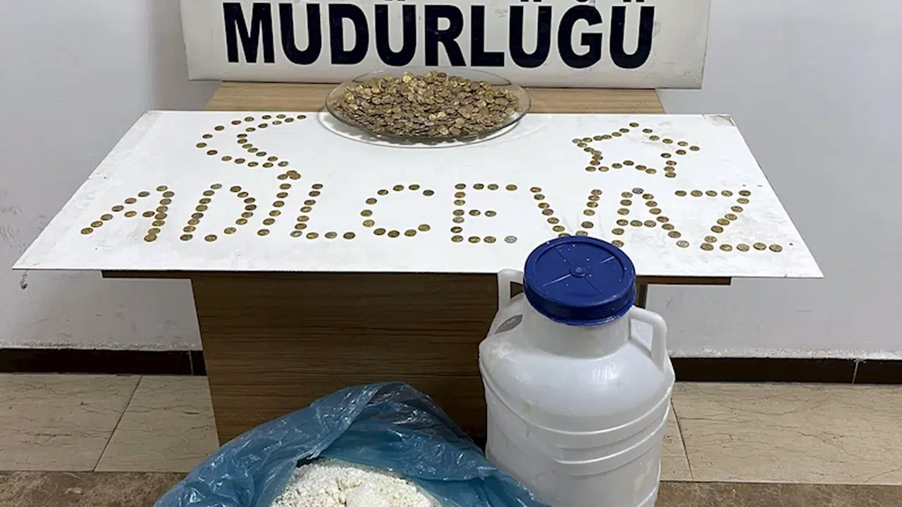 Adilcevaz İlçe Emniyet Müdürlüğü ekipleri, şüphe üzerine bir yolcu otobüsünü durdurup, arama yaptı. Otobüste yapılan aramada, 2 yolcuya ait olduğu belirtilen peynir bidonunun içerisinde Helenistik Dönem'e ait 900 adet altın sikke ele geçirildi. 2 şüpheli, '2863 Sayılı Kültür ve Tabiat Varlıklarını Koruma Kanununa muhalefet' suçundan gözaltına alındı. (DHA)