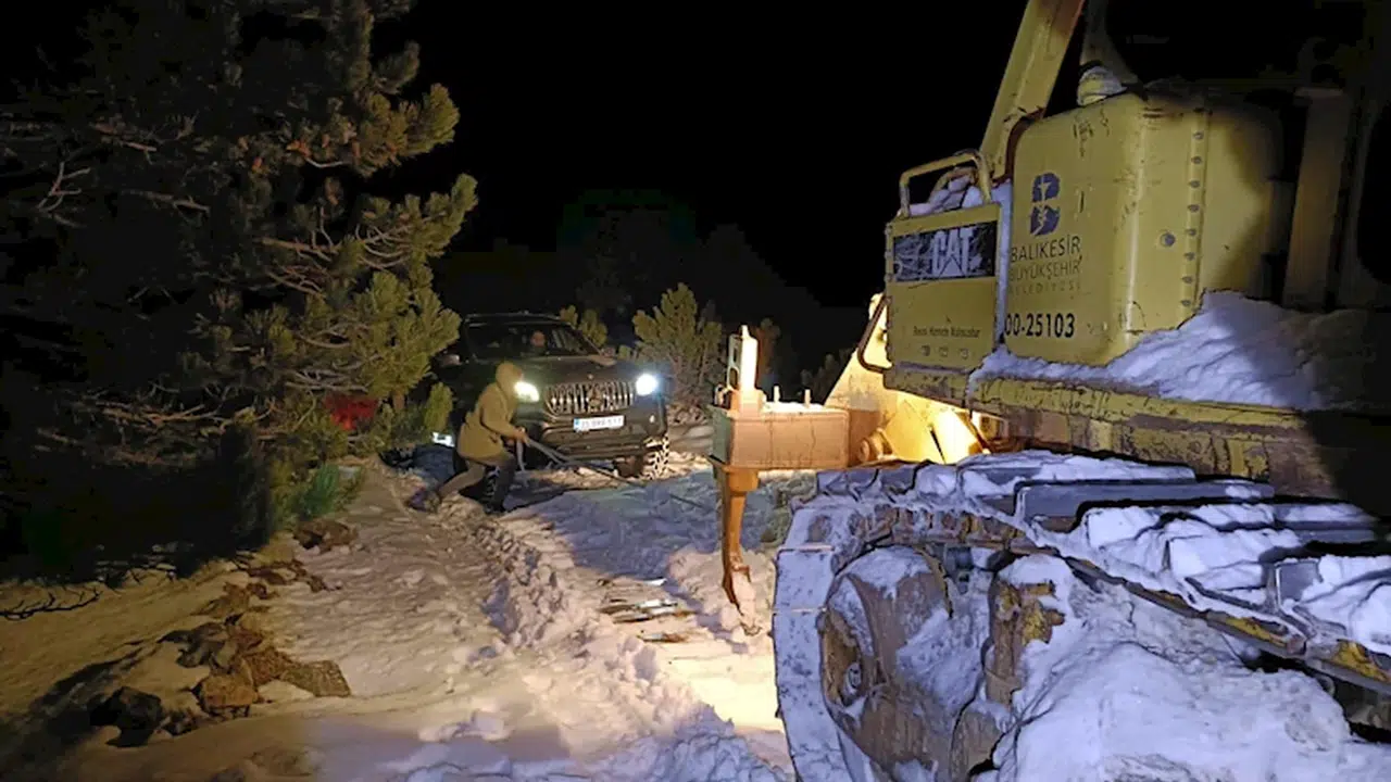 Olay, saat 21.00 sıralarında Edremit ilçesi Kazdağı Sarıkız Tepesi mevkinde yaşandı. İddiaya göre M.A. ile H.M., 35 BRB 515 plakalı pikapla çıktıkları tepede çamura saplanarak mahsur kaldı. M.A. ile H.M.'nin yardım talebi üzerine bölgeye itfaiye, Afet ve Acil Durum Yönetimi Başkanlığı (AFAD) ekipleri ile 2 arazi tipi araç ve 2 iş makinesi sevk edildi. Olay yerine gelen ekipler, karla kaplı arazide çamura saplanan pikabı, yaklaşık 4 saatlik çalışma sonucu kurtardı. Araçlarıyla beraber güvenli alana nakledilen M.A. ile H.M.'nın sağlık durumunun iyi olduğu öğrenilirken yetkililer, bölgedeki olumsuz hava ve yol şartlarına karşı vatandaşları dikkatli olmaları konusunda uyardı. (DHA)
