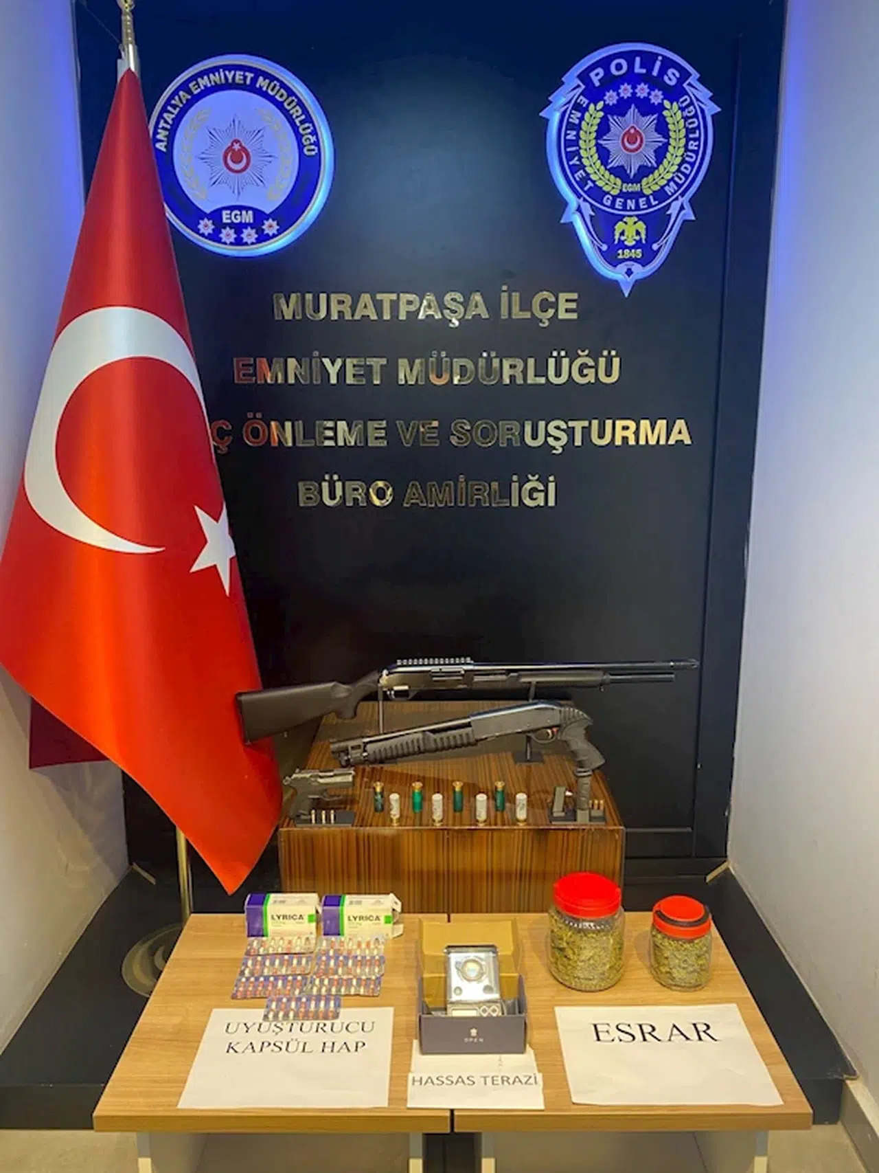 Antalya Emniyet Müdürlüğü Suç Önleme ve Soruşturma Büro Amirliği ekipleri, halkın huzur ve güvenliğini sağlamak, meydana gelebilecek suçların önlenmesini sağlamak, suç ve suçluyu yakalamak amacıyla 4 adrese eş zamanlı operasyon düzenledi. Ekiplerin Muratpaşa ilçe sınırları içerisinde yaptığı operasyonlarda; 2 adet pompalı tüfek, 1 adet ruhsatsız tabanca ve şarjör, 6 adet tabanca fişeği, 8 adet pompalı tüfek fişeği, 330 gram esrar maddesi, 94 adet hap, 1 adet hassas terazi ele geçirirken, 3 kişiyi de gözaltına aldı. 3 şüpheli hakkında adli ve idari işlem başlatıldı.