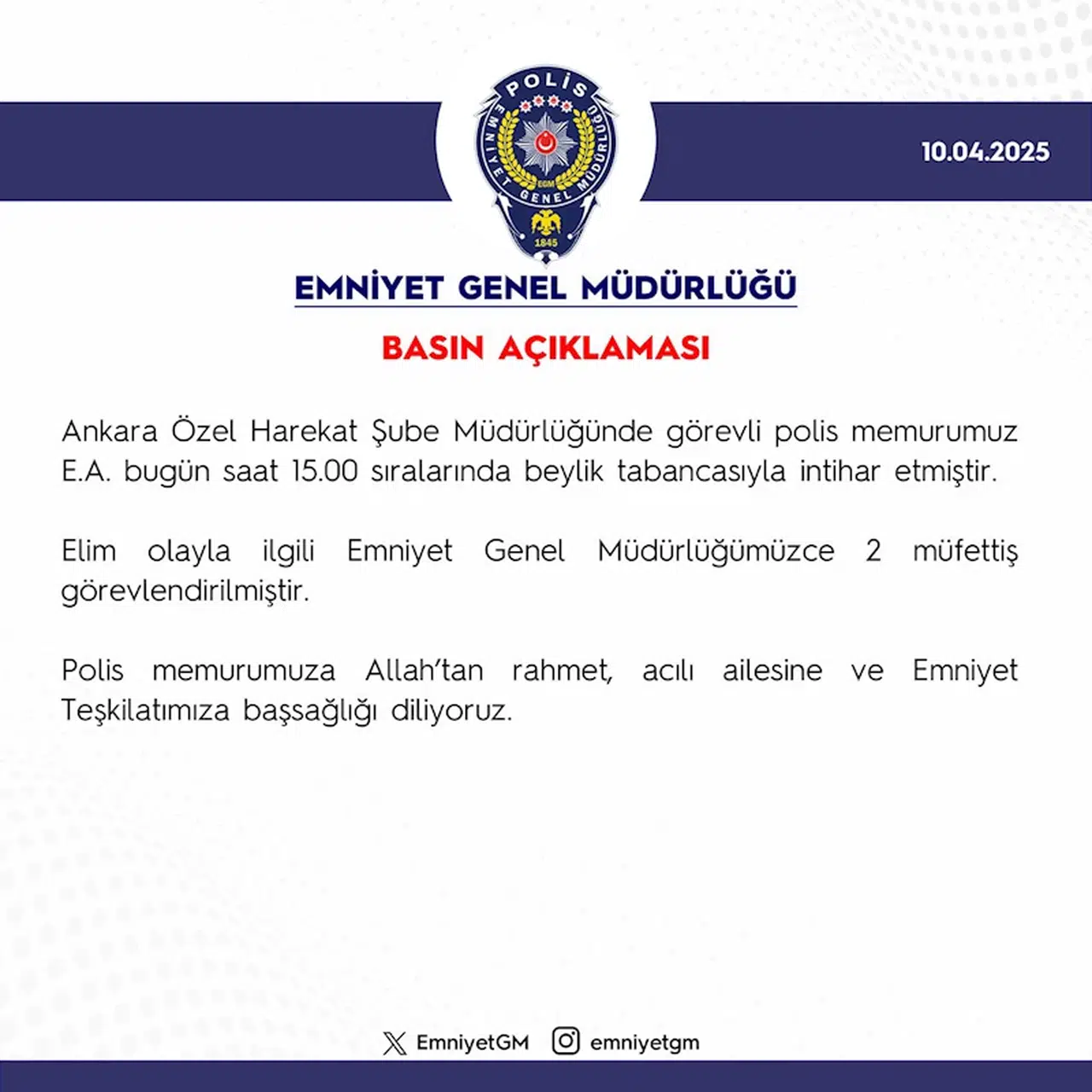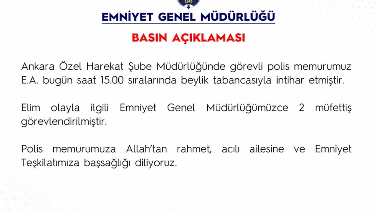 EGM'den yapılan yazılı açıklamada, "Ankara Özel Harekat Şube Müdürlüğünde görevli polis memurumuz E.A. bugün saat 15.00 sıralarında beylik tabancasıyla intihar etmiştir. Elim olayla ilgili Emniyet Genel Müdürlüğümüzce 2 müfettiş görevlendirilmiştir. Polis memurumuza Allah'tan rahmet, acılı ailesine ve Emniyet Teşkilatımıza başsağlığı diliyoruz" denildi. (DHA)