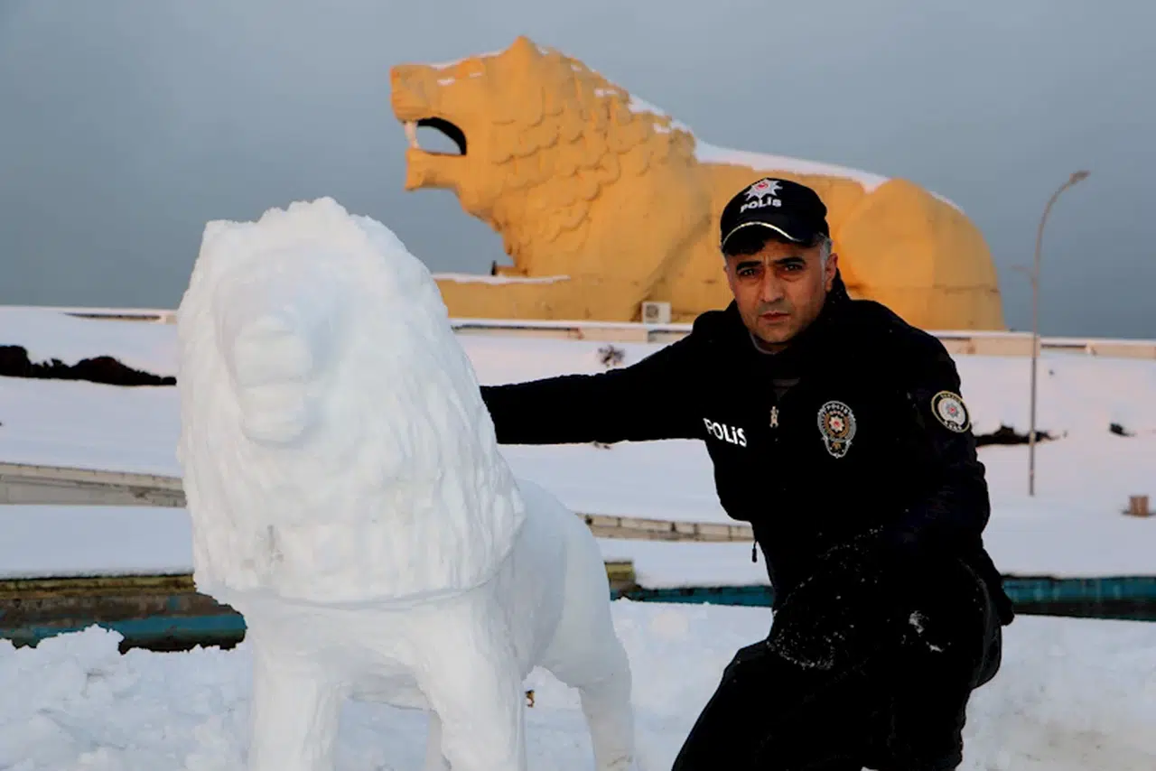 Samsun İl Emniyet Müdürlüğü Hassas Bölgeleri Koruma Şube Müdürlüğü’nde görevli polis memuru Tolga Aşlı, çocukluğundan bu yana ‘kar’a şekli veriyor. Kızıyla birlikte kardan hayvan figürleri yapan Aşlı, bu kez de aslan figürü yaptı. 24 yıldır polis memuru görevini sürdüren Aşlı, bu figürleri yaparken sadece bıçak kullanıyor. Tolga Aşlı, “2016 yılından bu yana Samsun İl Emniyet Müdürlüğü Hassas Bölgeleri Koruma Şube Müdürlüğü’nde görev yapıyorum. Resim ve heykeltıraş gibi sanatsal olan bu faaliyetlere çocukluktan gelen bir ilgim bulunuyor. Kar yağdığı zamanlarda da kızımla birlikte bu tarz etkinlikler yapıyoruz. Bu yaptığımız aslan figürü de onlardan biri" diye konuştu.