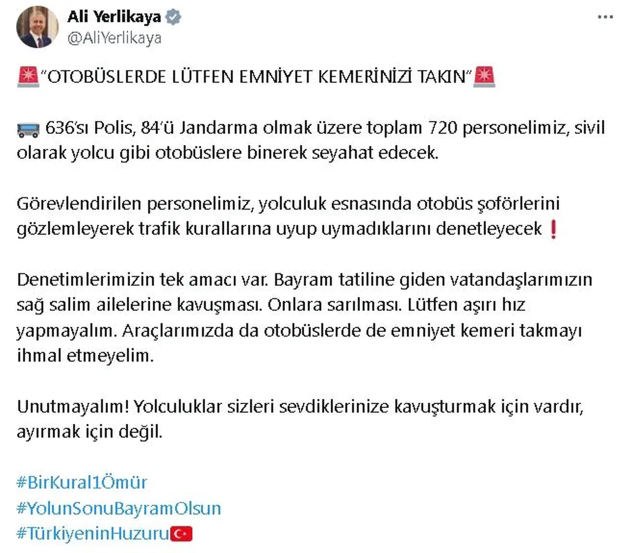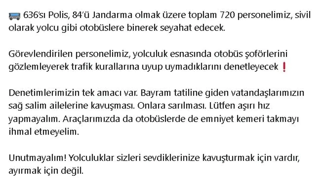 İçişleri Bakanı Ali Yerlikaya, sosyal medya hesabından yaptığı açıklamada, "636'sı polis, 84'ü jandarma olmak üzere toplam 720 personelimiz, sivil olarak yolcu gibi otobüslere binerek seyahat edecek. Görevlendirilen personelimiz, yolculuk esnasında otobüs şoförlerini gözlemleyerek trafik kurallarına uyup uymadıklarını denetleyecek. Denetimlerimizin tek amacı var. Bayram tatiline giden vatandaşlarımızın sağ salim ailelerine kavuşması, onlara sarılması. Lütfen aşırı hız yapmayalım. Araçlarımızda da otobüslerde de emniyet kemeri takmayı ihmal etmeyelim. Unutmayalım, yolculuklar sizleri sevdiklerinize kavuşturmak için vardır, ayırmak için değil" ifadelerini kullandı. (DHA)
