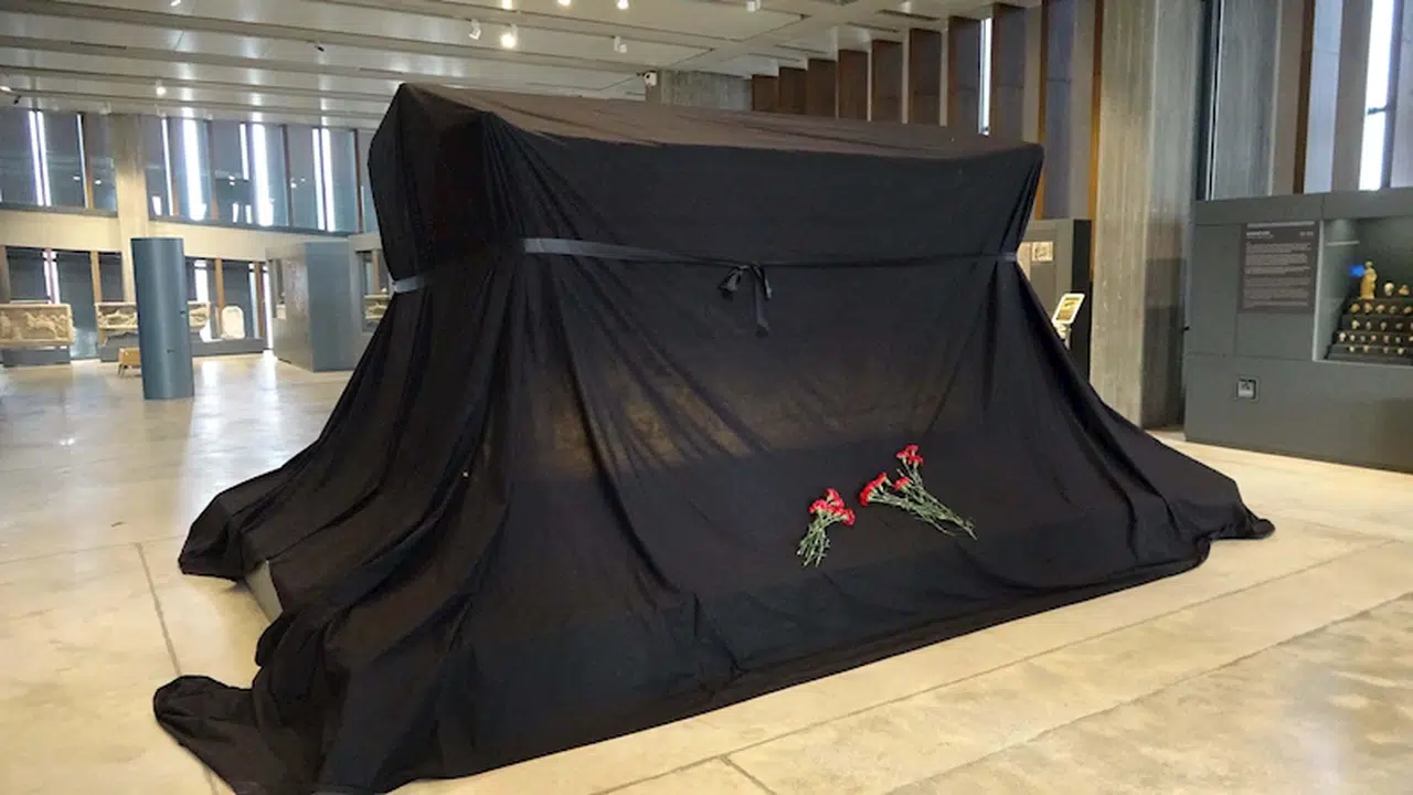 Nazif Cemhan ŞEN/ÇANAKKALE, (DHA)- ÇANAKKALE'de 5 bin yılı aşkın geçmişe sahip Troya Ören Yeri'nden çıkan eserlerin sergilendiği Troya Müzesi'nde bulunan Polyksena'nın kurban edilmesinin betimlendiği Polyksena Lahdi'nin üzeri, 25 Kasım Kadına Yönelik Şiddete Karşı Uluslararası Mücadele Günü'nde siyah örtüyle kapatıldı.