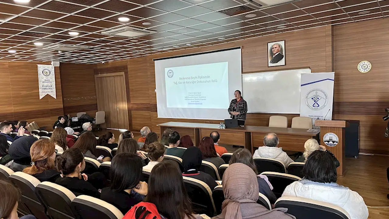Trakya Üniversitesi Genetik ve Biyoteknoloji Topluluğu tarafından 'Beslenme Beyin İlişkisinde Yağ, Kas ve Karaciğerin Rolü' konulu söyleşi düzenlendi. Söyleşiye katılan Marmara Üniversitesi Sağlık Hizmetleri Meslek Yüksekokulu Hizmetler ve Teknikler Bölümü Öğretim Görevlisi Prof. Dr. Meral Yüksel, öğrencilere beyin ve beslenme konusunda sunum yaptı. Obezitenin giderek arttığı dünya genelinde, yeme alışkanlıklarının sadece beslenmeyle değil duygusal olarak da etkilendiği belirten Yüksel, "Beyin ve beslenmeye baktığımızda biliyorsunuz dünyada yaygın bir şekilde bir obezite toplumu söz konusu. Bu obez topluma baktığımızda özellikle bu yeme alışkanlıklarının sadece beslenmeyle ilgili değil, duygusal anlamda da etkilendiğini görüyoruz. Öte yandan beslenmenin yarattığı en önemli etkilerden bir tanesi de yağ dokusunun artışıyla ilgilidir. Günümüzdeki teknolojik gelişmelerle birlikte biliyoruz ki bu yağ dokusundan salgılanan birtakım moleküller var. Bu moleküllerin beynimizi de etkilediği artık günümüzde bilinmekte" dedi.