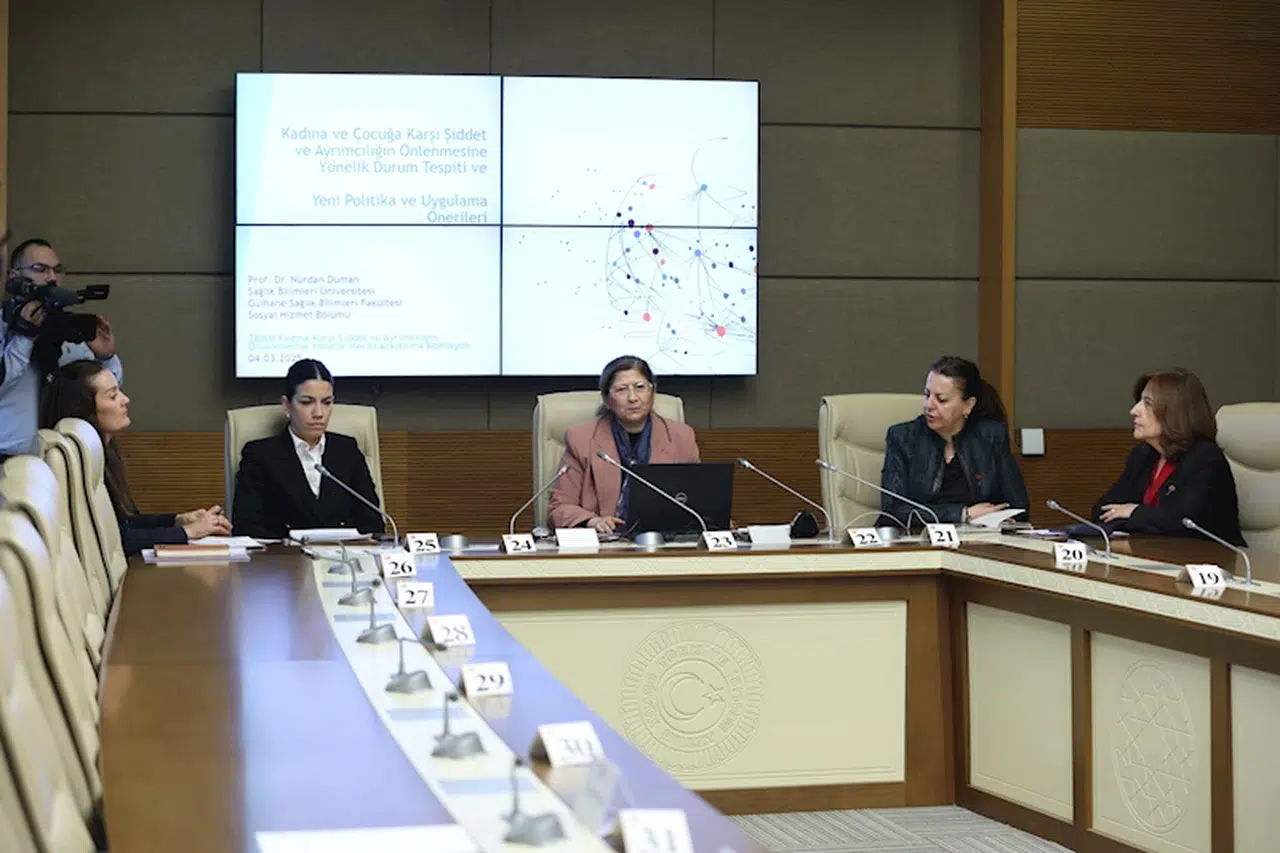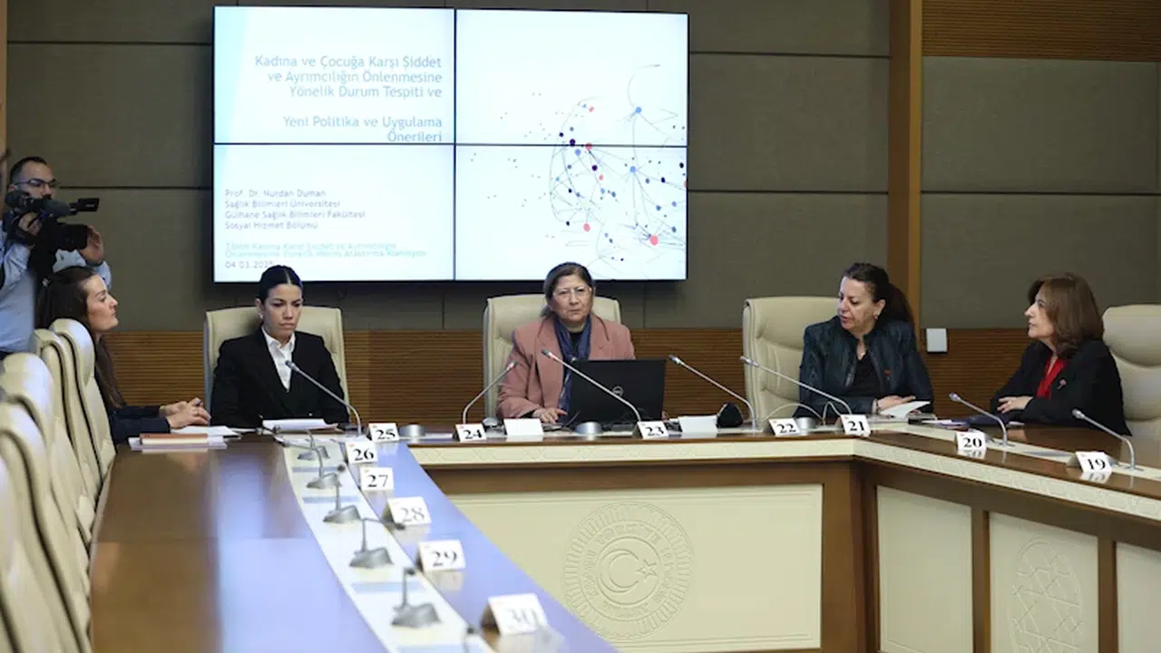 Komisyon Başkanı Cevizoğlu'nun ardından Sağlık Bilimleri Üniversitesi, Gülhane Sağlık Bilimleri Fakültesi Sosyal Hizmet Anabilim Dalı Başkanı Prof. Dr. Nurdan Duman, sunum yaptı. Duman, Türkiye Kadın Dernekleri Federasyonu tarafından gerçekleştirilen bir çalışmayı paylaşarak, "Ev İçi Şiddet Acil Hattı'na yapılan aramalar sonucunda ortaya çıkan istatistiklere göre; 15 Ekim 2007'den bugüne kadar toplamda 82 bin 253 çağrı geldiğini görüyoruz. Arayan kişilerin sorunlarına çözüm adına hukuki ve psikolojik destek sağlanıyor. 7 gün 24 saat esasına göre çalışıyor; İngilizce, Arapça, Kürtçe ve Farsça dillerinde hizmet veriyor. Aramaları ilk olarak sosyal hizmet uzmanları ya da psikologlar yanıtlıyor; acil durum vakalarında polis ve jandarmanın danışana en kısa sürede ulaşmasını sağlamak üzere çeşitli çalışmalar yapılıyor. Daha sonra danışanın sağlanan hizmet ve önerilerin takibi yapılıyor. Mümkün olan en az zararla kişinin uğramış olduğu şiddetten uzaklaştırılması prensibine dayalı olarak çalıştığını görüyoruz" diye konuştu.