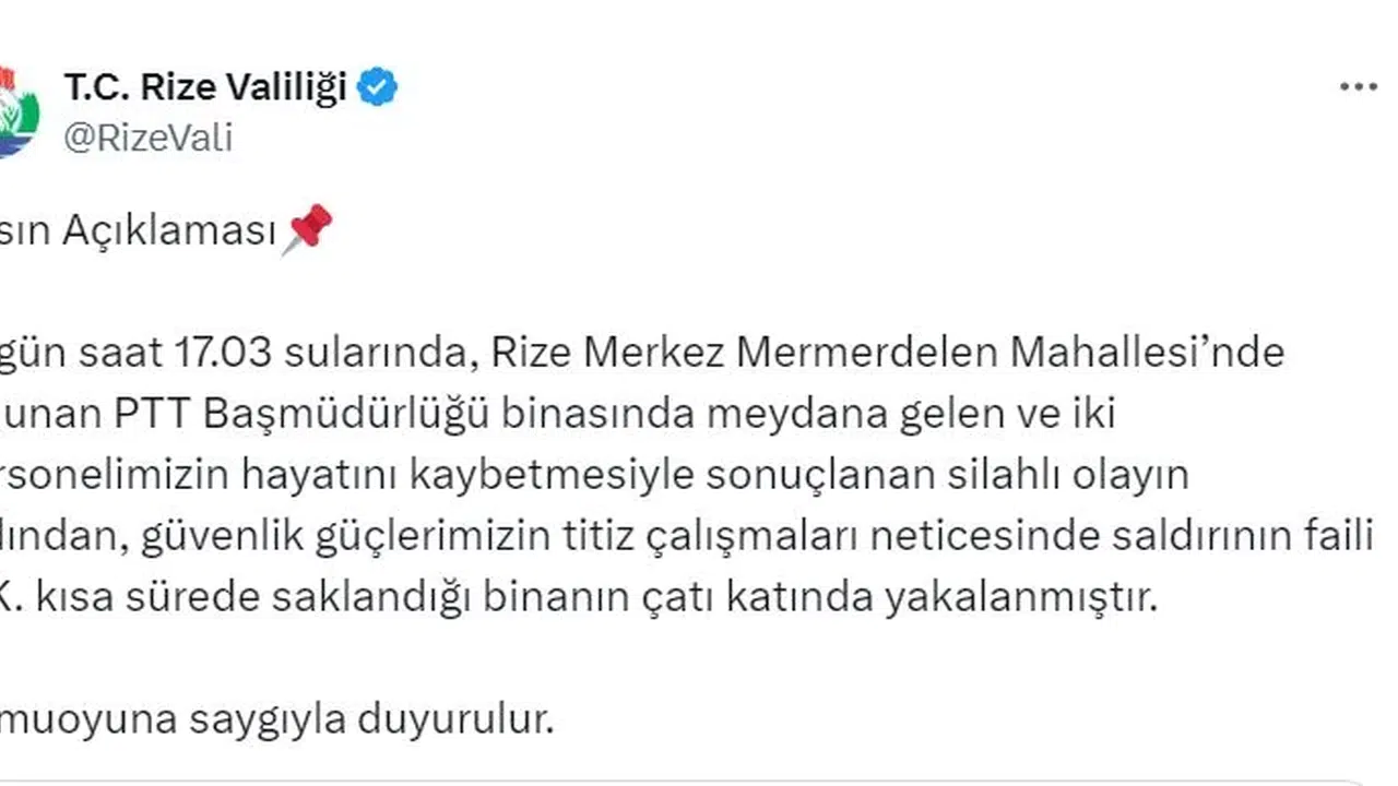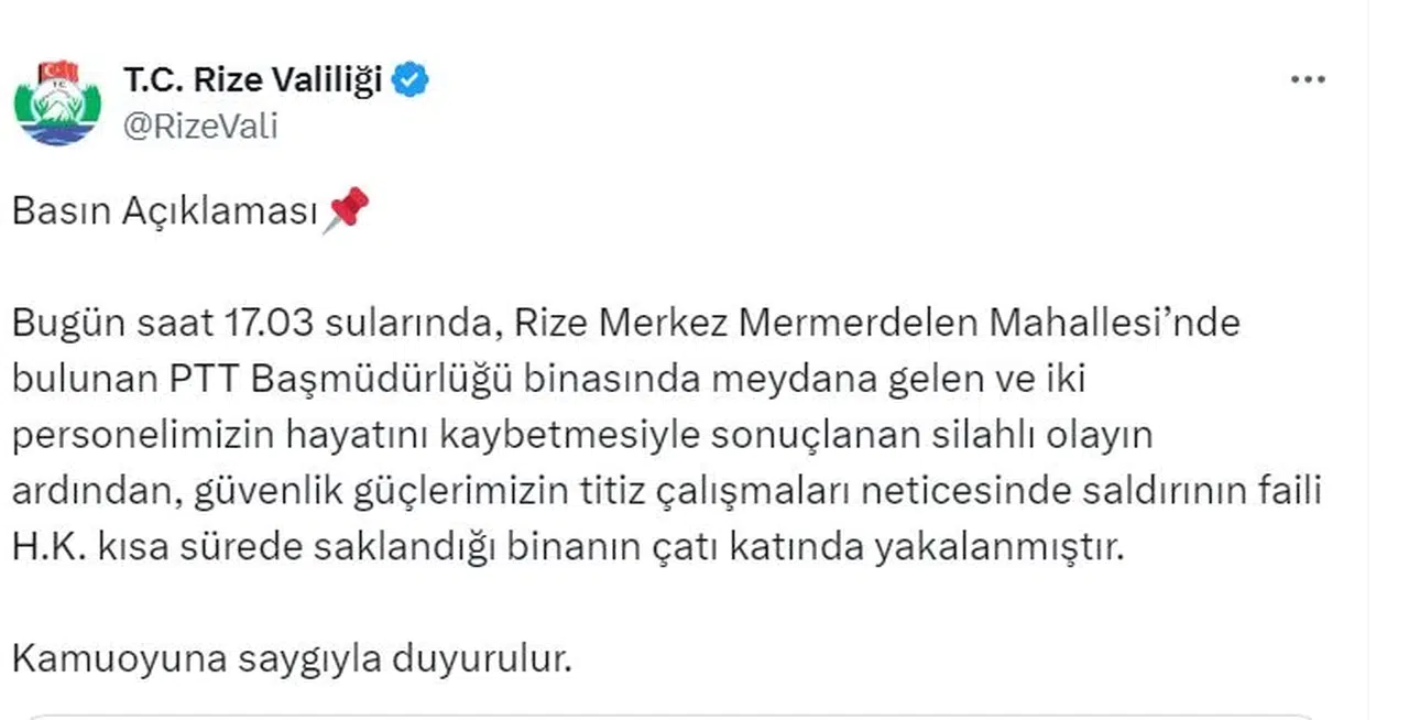 İçişleri Bakanı Ali Yerlikaya sosyal medya hesabından yaptığı paylaşımda, “Rize Merkez Mermerdelen Mahallesi’nde bulunan PTT Başmüdürlüğü binasında meydana gelen ve iki PTT personeli kardeşimizin hayatını kaybettiği silahlı saldırıyı gerçekleştiren şüpheli H.K. kısa sürede saklandığı binanın çatı katında yakalanmıştır. Saldırıda hayatını kaybeden kardeşlerimize Allah’tan rahmet, kederli ailelerine ve PTT camiasına başsağlığı dilerim” ifadelerini kullandı.