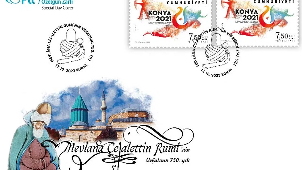 PTT AŞ tarafından “Mevlana Celalettin Rumi’nin Vefatının 750.Yılı” konulu özelgün zarfı 17 Aralık 2023 tarihinde tedavüle sunuldu.