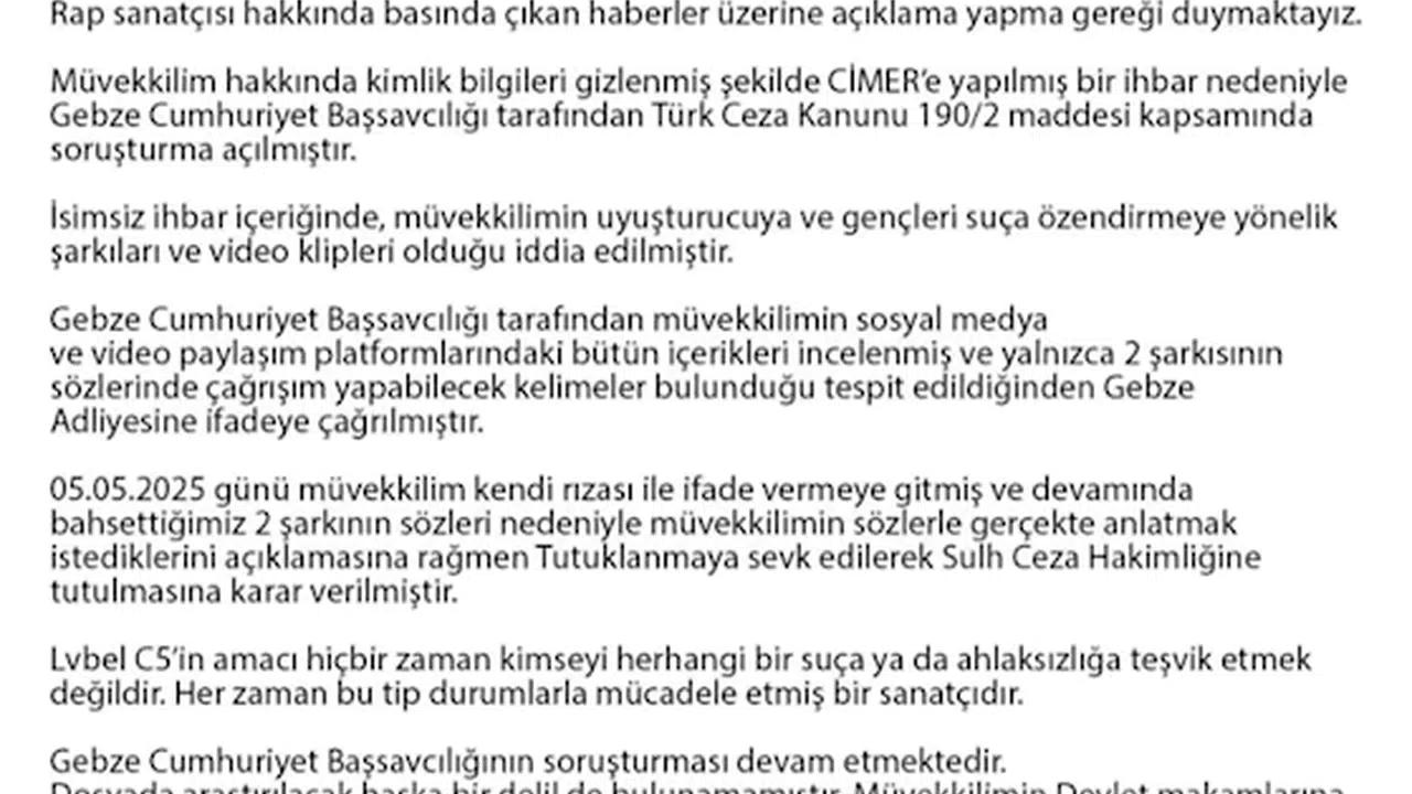 5 Mayıs’ta müvekkilinin kendi rızası ile ifadeye vermeye gittiğini belirten Avukat Lokman, “Devamında bahsettiğimiz 2 şarkının sözleri nedeniyle müvekkilimin sözlerle gerçekte anlatmak istediklerini açıklamasına rağmen tutuklanmaya sevk edilerek Sulh Ceza Hakimliği’ne tutulmasına karar verilmiştir. Lvbel C5'in amacı hiçbir zaman kimseyi herhangi bir suça ya da ahlaksızlığa teşvik etmek değildir. Her zaman bu tip durumlarla mücadele etmiş bir sanatçıdır. Gebze Cumhuriyet Başsavcılığı’nın soruşturması devam etmektedir. Dosyada araştırılacak başka bir delil de bulunamamıştır. Müvekkilimin devlet makamlarına saygısı sonsuzdur ve hakkında yapılan bu işlemler nedeniyle gerçeğin ortaya çıkacağına olan inancı tamdır. En kısa zamanda müvekkilim hakkındaki gerçeğin ortaya çıkması ile başarılı müzik hayatına kaldığı yerden devam edecektir” ifadelerini kullandı. (DHA)
