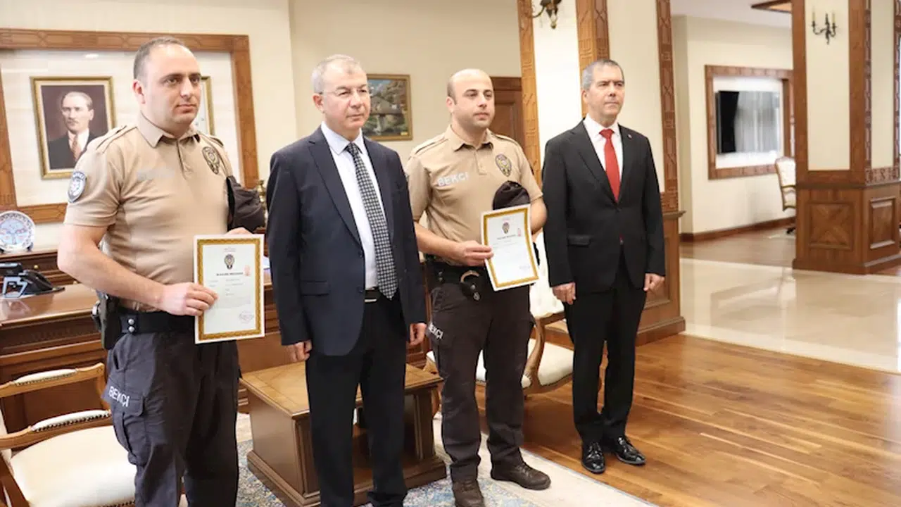 Vali Yılmaz Doruk makamında kabul ettiği İl Emniyet Müdürü Ali Kemal Kurt ile bekçiler Muhammed Kara (35) ve Ömer Çaycı’ya (35) göstermiş olukları üstün gayret ve özverili çalışmalarından dolayı teşekkür ederek başarı belgesi verdi. Bekçilere başarı belgelerini veren Vali Doruk, “Cumhurbaşkanımızın talimatlarıyla gece bekçiliği, mahalle bekçiliği teşkilatı yeniden güçlü bir şekilde yapılandırıldı ve kolluk teşkilatımız da yine önemli bir yere geldi. Ülkemizin 81 ilinde polis teşkilatımızın içerisinde diğer kolluk kuvvetlerimizle birlikte görevlerini yerine getirmektedir. Özellikle geceleri yaptığı devriye çalışmalarıyla vatandaşımızın huzurunun sağlanmasında önemli role sahiptir. Bekçilerimiz bir taraftan vatandaşlarımıza güven verip huzur kaynağı olurken suçlular tarafından da tabii ki tedirginlik kaynağı olmaktadır. Çünkü zaman zaman yaptıkları çalışmalarla gerçekten çok önemli olaylara imza atmaktadırlar. Bizim iki bekçi arkadaşımızda yaptıkları bir devriye sırasında çok dikkatli davranmaları nedeni ile çok önemli bir olaya imza attılar. Kendilerine teşekkür ediyoruz. Dikkatleri sayesinde şüphelendikleri bir aracı incelemeleri sonucunda tarihi ve kültür varlığını barındıran bir aracın tespitini sağladılar. Önemli bir kaçakçılık tarihi, kültür varlığı kaçakçılığına da önüne geçmiş olduk. Ben kendilerine çok teşekkür ediyorum. Bekçilerimiz sokaklarda görevlerini yaparken alandaki kişilerin şüpheli davranışlarından yola çıkarak olağan dışı bir durum olduğunu anlamışlar. Daha sonra da şüphelileri adli makamlara teslim etti” ifadelerini kullandı.(DHA)