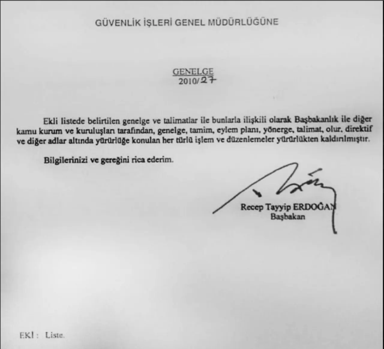 Öte yandan RTÜK Başkanı Daniş sosyal medya paylaşımında dönemin Başbakanı, Cumhurbaşkanı Recep Tayyip Erdoğan’ın kamu kurumlarının genelge, bildiri ve benzeri yayınlarını yürürlükten kaldırdığına dair yayınladığı genelge belgesini yer verdi.
