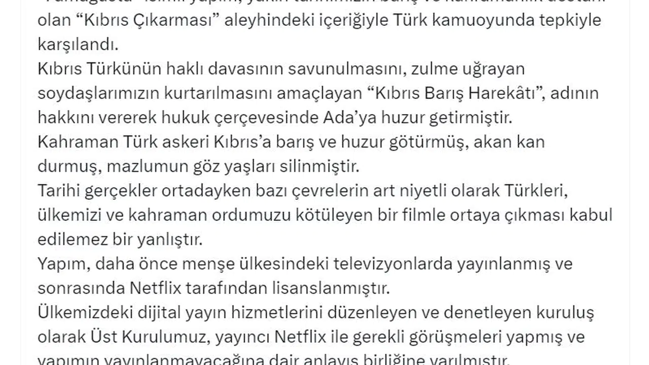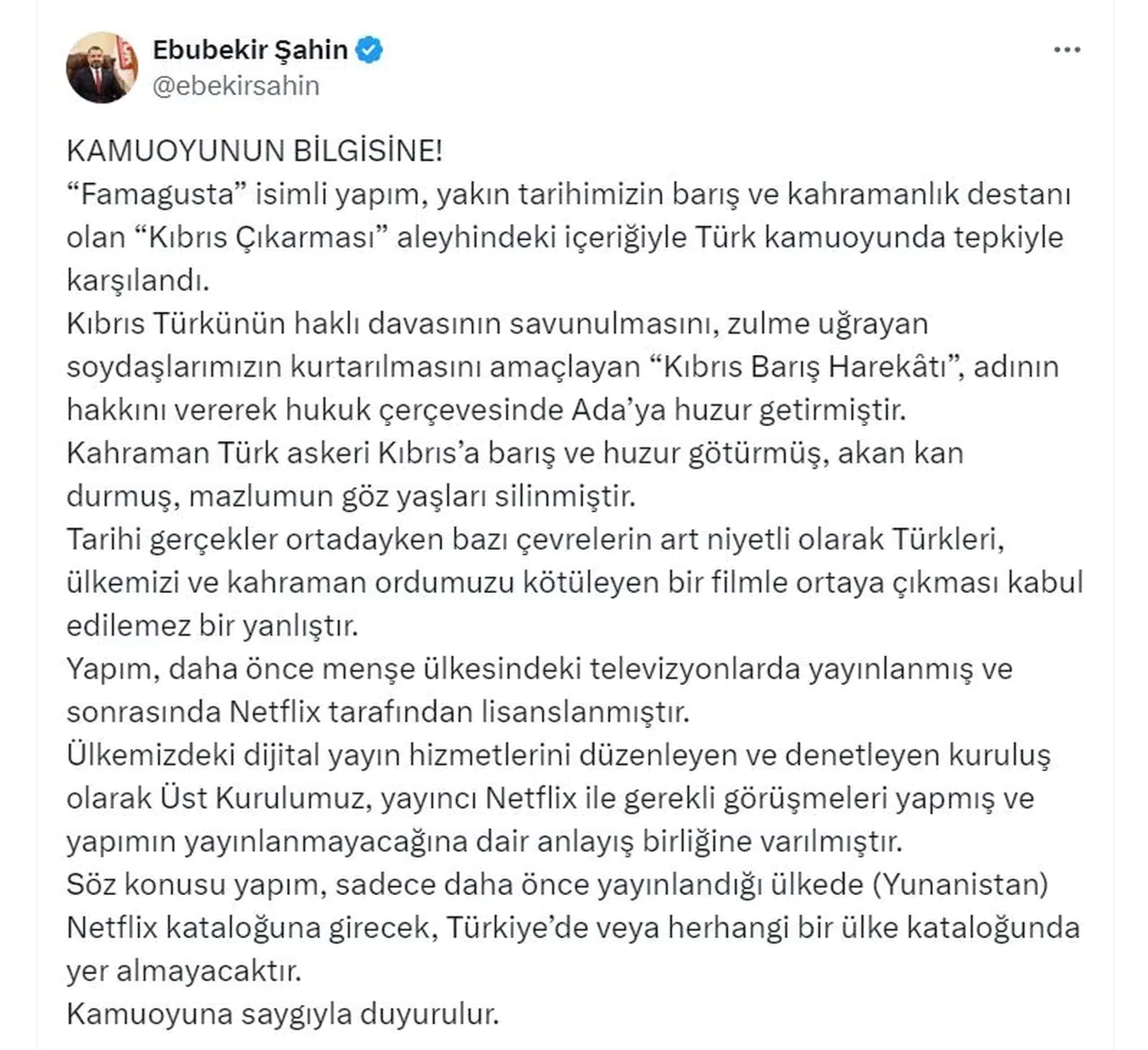 ANKARA, (DHA)- RADYO ve Televizyon Üst Kurulu (RTÜK) Başkanı Ebubekir Şahin, Netflix'in Türkiye'de tepki çeken 'Famagusta' dizisine ilişkin, "Üst Kurulumuz, yayıncı Netflix ile gerekli görüşmeleri yapmış ve yapımın yayınlanmayacağına dair anlayış birliğine varılmıştır" dedi.