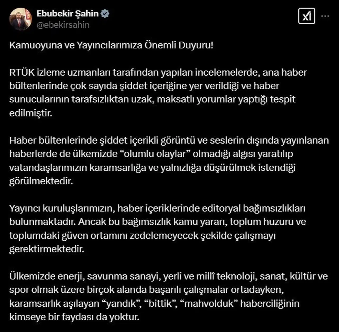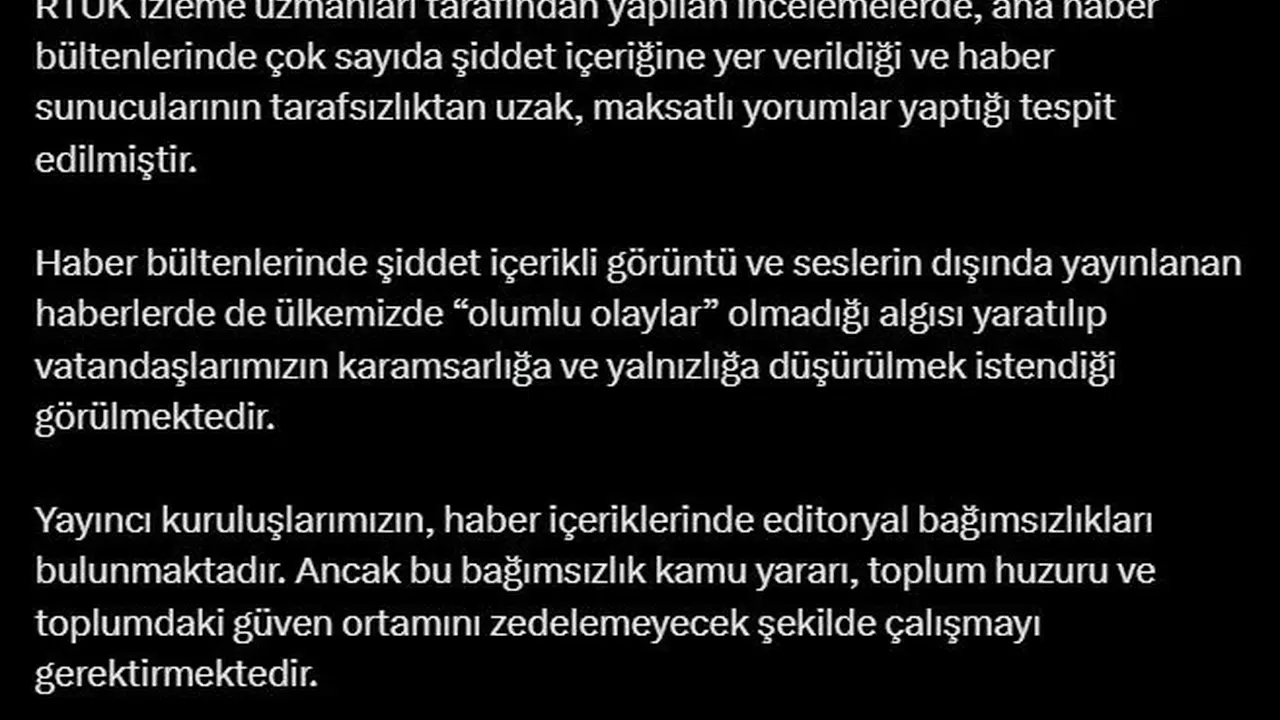 RTÜK Başkanı Ebubekir Şahin, sosyal medya hesabından yaptığı açıklamada, "RTÜK izleme uzmanları tarafından yapılan incelemelerde, ana haber bültenlerinde çok sayıda şiddet içeriğine yer verildiği ve haber sunucularının tarafsızlıktan uzak, maksatlı yorumlar yaptığı tespit edilmiştir. Haber bültenlerinde şiddet içerikli görüntü ve seslerin dışında yayınlanan haberlerde de ülkemizde olumlu olaylar olmadığı algısı yaratılıp vatandaşlarımızın karamsarlığa ve yalnızlığa düşürülmek istendiği görülmektedir. Yayıncı kuruluşlarımızın, haber içeriklerinde editoryal bağımsızlıkları bulunmaktadır. Ancak bu bağımsızlık kamu yararı, toplum huzuru ve toplumdaki güven ortamını zedelemeyecek şekilde çalışmayı gerektirmektedir. Ülkemizde enerji, savunma sanayi, yerli ve milli teknoloji, sanat, kültür ve spor olmak üzere birçok alanda başarılı çalışmalar ortadayken; karamsarlık aşılayan, 'yandık, bittik, mahvolduk' haberciliğinin kimseye bir faydası da yoktur" dedi.