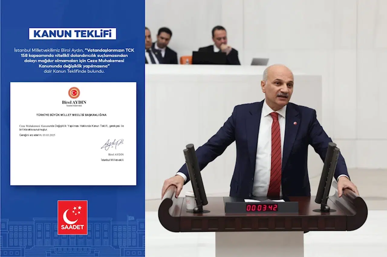 ANKARA, (DHA)- SAADET Partisi İstanbul Milletvekili Birol Aydın, Türk Ceza Kanunu’nun 158. maddesinin f bendine ilişkin mağduriyetleri gidermeyi amaçlayan kanun teklifine ilişkin, “Bu düzenleme sayesinde, gençlerin suçsuz oldukları bir süreçte, mağduriyetlerin daha hızlı bir şekilde giderilmesi mümkün olacak. Böylece, haksız yere ceza almış gençlerin cezalandırılmasının önüne geçilecek” dedi.