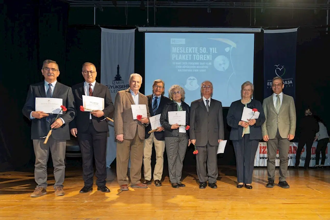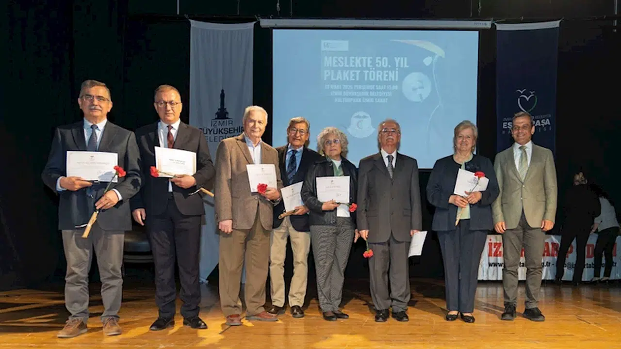 Törende doktorlara plaketleri Türk Tabipler Birliği Merkez Konseyi Başkanı Prof. Dr. Alpay Azap ve İzmir Tabip Odası Başkanı Prof. Dr. Mehmet Ceyhun Özyurt takdim etti. Onur plaketi alan 74 yaşındaki Halk Sağlığı Uzmanı Dr. Lütfiye Coşkun, "Eskiden 50 yılı nasıl yaşıyorlar diye merak ederdim. 50 yılı gördüm, çok mutlu oldum. Hekim olmak insana hizmet etmek demek. İnsan hayatına o kadar dokunmak ki onu sarıp sarmalamak demek. Ben ölmeden sağlıklı bir toplum oluşturabildiğimizi görmek istiyorum" dedi. Meslek hayatında unutamadığı bir anıyı anlatan Dr. Coşkun, "8 yıl boyunca çocuğu olmayan hamile bir kadın sağlık ocağına gelmişti ama kadında kabakulak vardı. Gebeliğin sonlandırılması gerekiyordu ama kadın 'Sakat doğsa da doğuracağım' dedi. Onunla beraber ben de 9 ay sancı çektim. Bu çok nadir olur ama kadının bebeği herhangi bir sağlık sorunu olmadan doğdu. Ben genetik hastalıkları önlemeyi isteyen bir hekimim ve toplum olarak hasta olmadan önce sağlığın farkına varılmasını istiyorum. Meslekte 50 yılı gördüm, dilerim bunu da ölmeden görürüm" diye konuştu. Plaket alan bir diğer doktor 73 yaşındaki İç Hastalıkları Uzmanı Dr. Haksun Acet ise 1975 yılında Ege Üniversitesi'nden mezun olduğunu anlattı. Meslekte 50. yıla ulaştığı için çok mutlu olduğunu ifade etti.