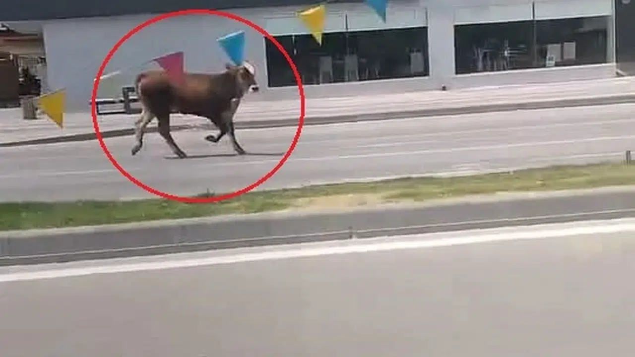 Olay, Mahmudiye Mahallesi Ertuğrulgazi Caddesi’nde meydana geldi. Hayvan pazarından alınan kurbanlık inek, eve götürüldüğü sırada sahibinin elinden kurtularak kaçtı. Kaldırımdan yola inerek, otomobillerin ortasında koşmaya başlayan inek, trafiği birbirine kattı. Sahibinin yakalamaya çalıştığı ineğin önü kamyonetle kesildi. İnek kaçmaya devam ederken, o anlar çevredekiler tarafından cep telefonu ile görüntülendi. (DHA)