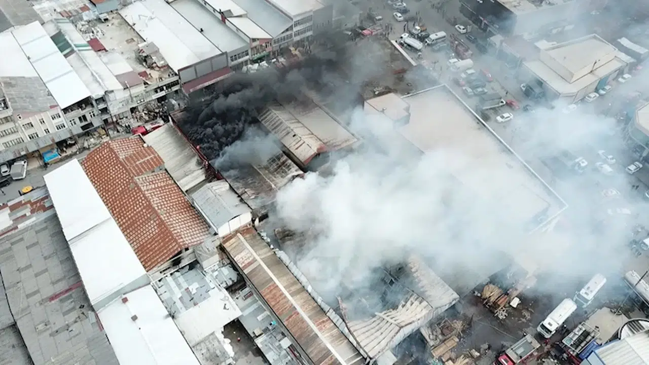 Sakarya'nın Serdivan ilçesinde ASEM Mobilyacılar Çarşısı'nda mobilya imalathanesinde, saat 13.00 sıralarında çıkan ve ve sebebi henüz belirlenemeyen yangın havadan görüntülendi. Sakarya Büyükşehir Belediyesi ekipleri, 12 ekip ve 30 itfaiye eriyle yangına müdahaleyi sürdürüyor. (DHA)