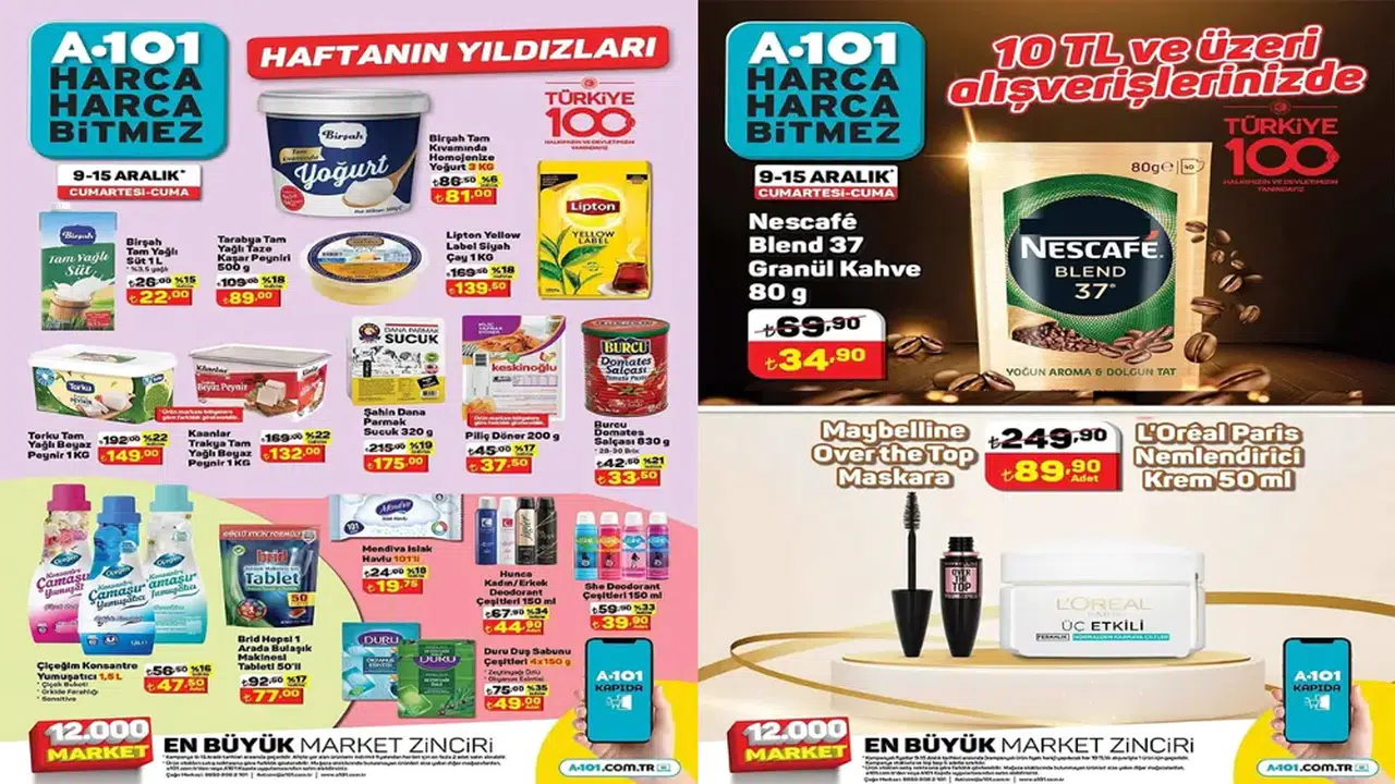 Homojenize yoğurt, tam yağlı taze kaşar peyniri, tam yağlı süt, siyah çay, dana parmak sucuk, piliç döner, domates salçası, ıslak havlu, bulaşık makinesi tableti, yumuşatıcı, duş sabunu çeşitleri, deodorant çeşitleri ve Trakya beyaz peynir gibi ürünlerin yer aldığı 9-15 Aralık tarihleri arasında geçerli olacak A101 kataloğu yayınlandı.