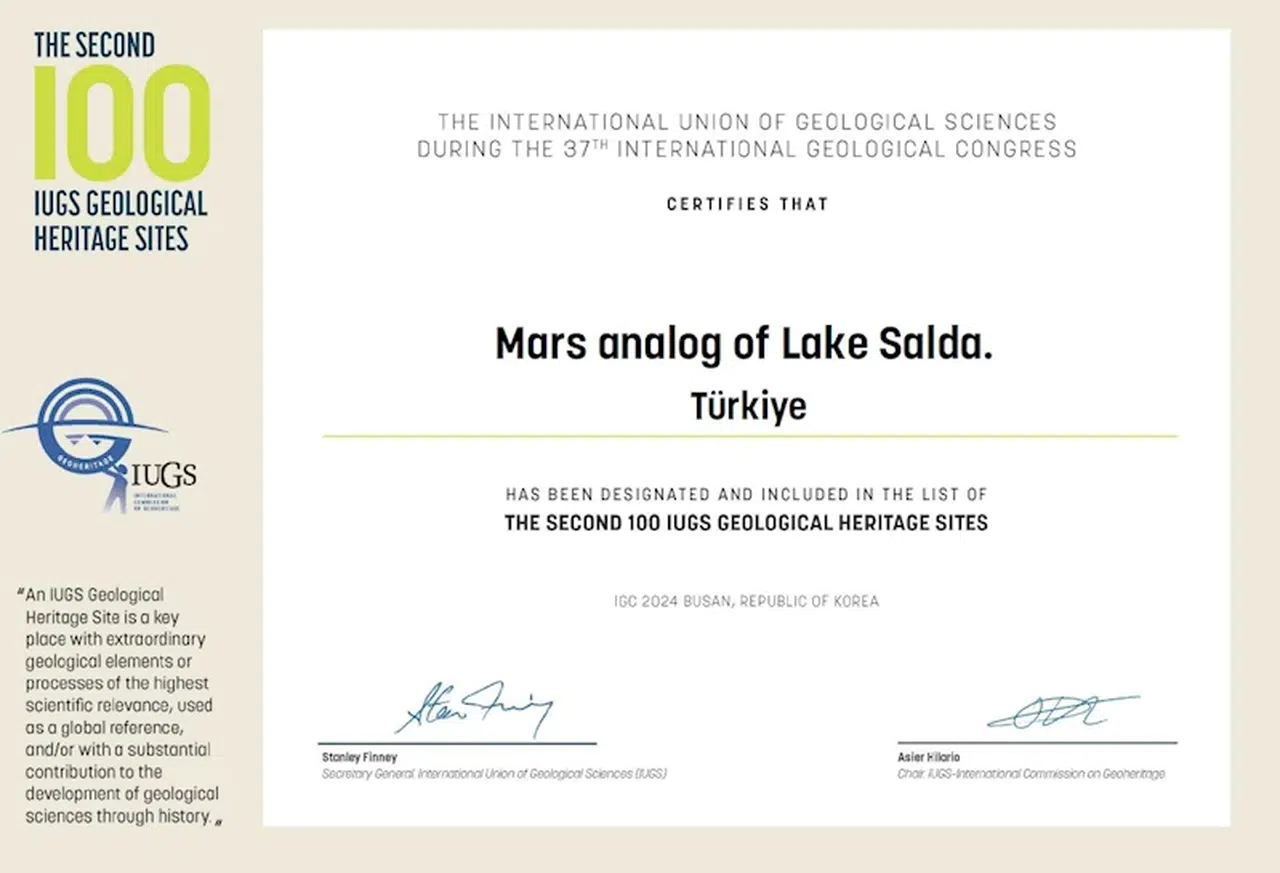 UNESCO Türkiye Milli Komisyonu'ndan yapılan açıklamaya göre; Güney Kore'nin Busan kentinde 28 Nisan 2024 tarihinde toplanan 37'nci Dünya Jeoloji Kongresi'nde UNESCO'nun desteğiyle gerçekleştirilen Uluslararası Jeoloji Bilimleri Birliği (IUGS) projesi kapsamında, iki yıldır devam eden bilimsel değerlendirmeler sonucunda, ikinci etap 'Dünyanın En Önemli 100 Jeolojik Mirası' açıklandı. Salda Gölü de 'Mars’ın yeryüzündeki temsilcisi' sıfatıyla bu miraslardan biri olarak seçildi. IUGS Başkanı Prof. John Luden, listeyi açıklamak için düzenlediği basın toplantısında, "Yerkürenin en önemli miraslarını biz tespit ediyoruz. Aynı zamanda korunmaları için taraf ülkelere çağrı yapıyoruz. Bunlar yok olduğunda asla yerine konulamaz ve yerkürenin jeolojik geçmişinden bir parça kaybolur" dedi.