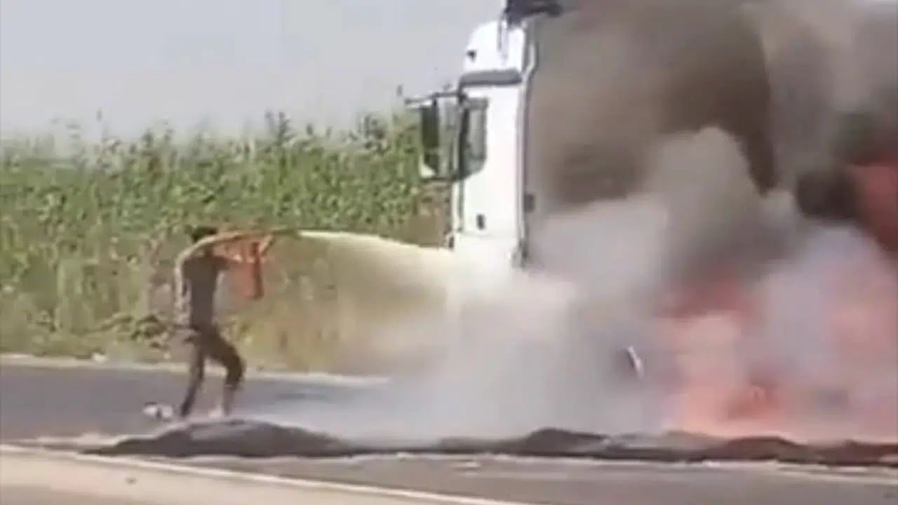 Bu sırada bir kişi, yangın söndürme tüpüyle alev topuna dönen araca müdahale etmeye çalışırken patlama meydana geldi. Patlama anı cep telefonu kamerasıyla kaydedildi. Yangın itfaiyenin müdahalesiyle söndürülürken, TIR kullanılamaz hale geldi.