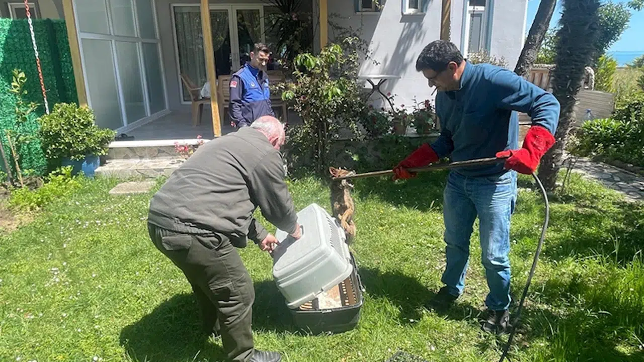 Ev sahibi, bahçesindeki çakalı görünce Yakakent Belediyesi zabıta ekiplerine haber verdi.