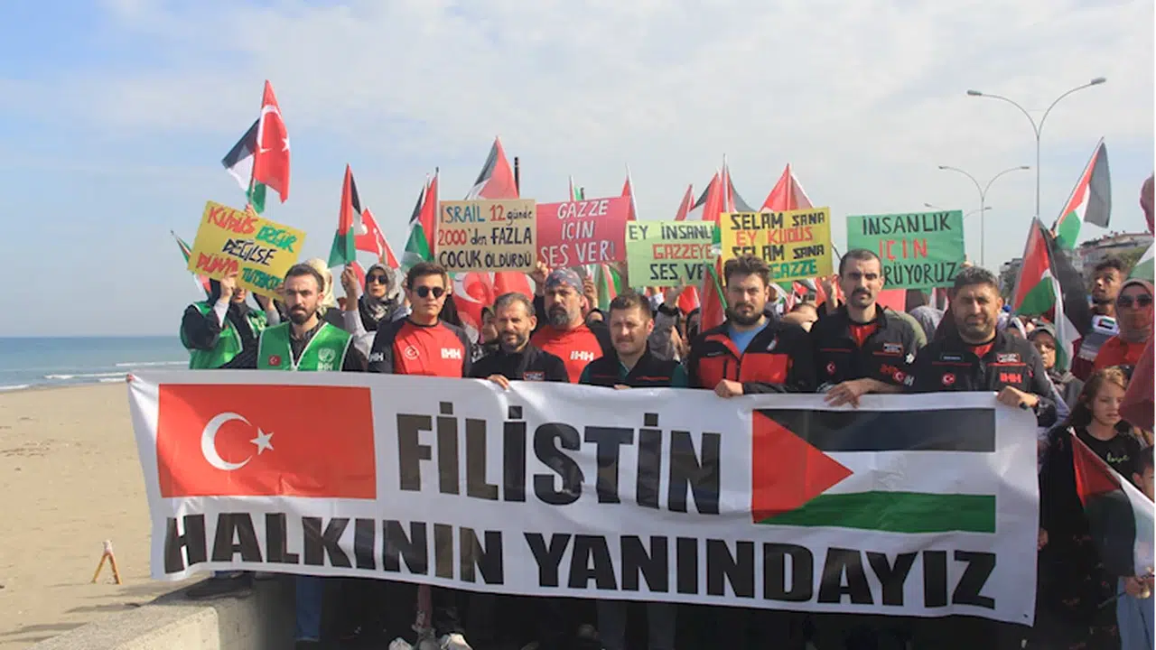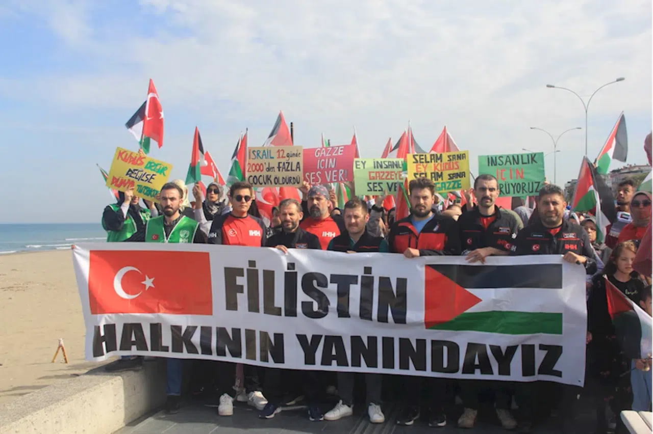 Atakum ilçesindeki bir alışveriş merkezinin önünde bir araya gelen vatandaşlar, Türkiye ve Filistin bayraklarıyla Çobanlı İskelesi'ne kadar yürüdü.