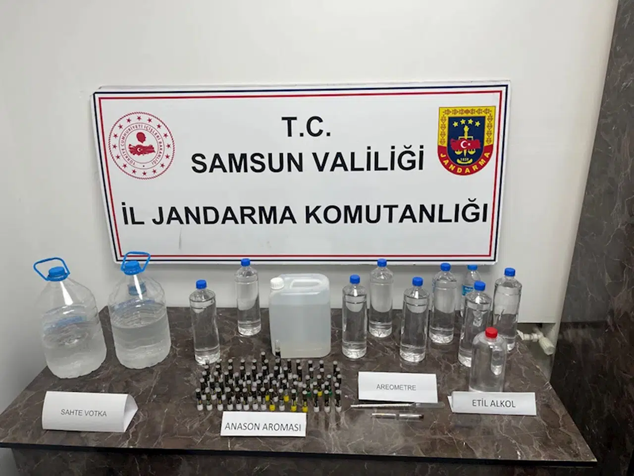 Ekipler, belirlenen adreste yaptıkları aramalarda, 14 litre etil alkol, 6 litre sahte votka, 52 içki aroma kiti, 7 tahıl aroması kiti ve 2 alkol yoğunluk ölçüm cihazı ele geçirdi.