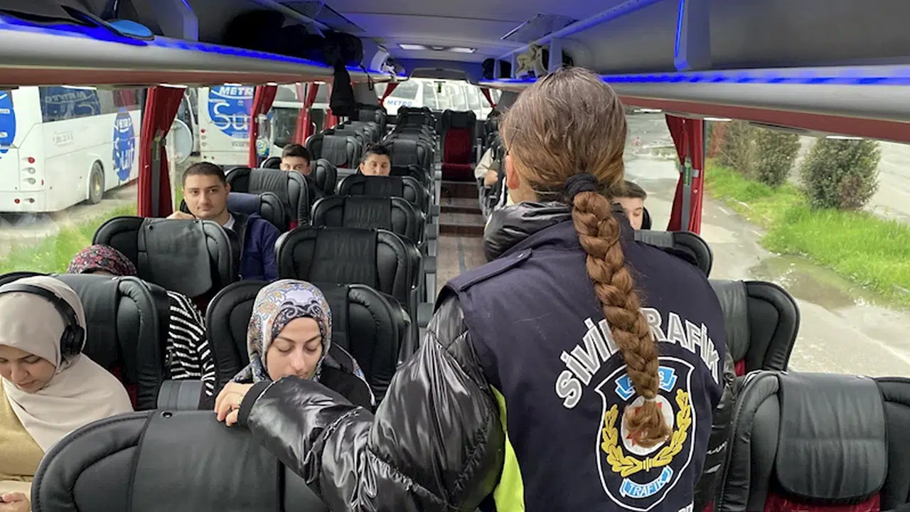 İl Emniyet Müdürlüğü Trafik Denetleme Şube Müdürlüğü ekipleri, şehirlerarası yolculuk yapan vatandaşların güvenle seyahat edebilmesi amacıyla Samsun Şehirlerarası Otobüs Terminali’nde trafik denetimi gerçekleştirdi. Yapılan denetimde, yolcu taşımacılığı yapan otobüslere yönelik hız, emniyet kemeri, sürücü belgeleri, takograf kullanımı kontrolü yapıldı. Seyahat eden yolcular için de emniyet kemerinin öneminden bahsedildi. (DHA)