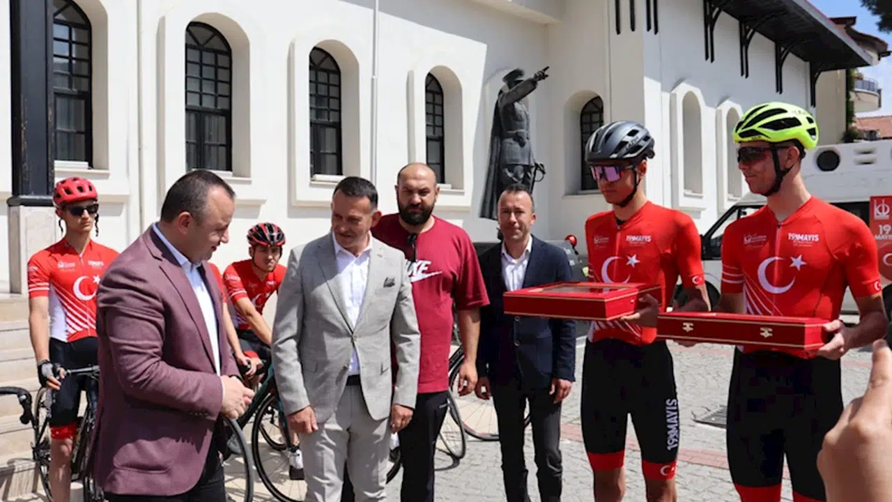 Bisikletlileri Amasya'dan yolcu eden Belediye Başkanı Turgay Sevindi, bir gece Amasya'da misafir edilen Türk bayrağı ile toprağı, sporculara yeniden teslim etti.