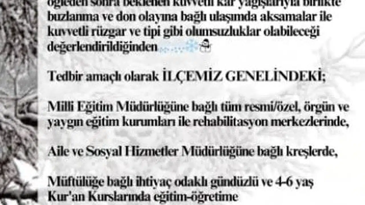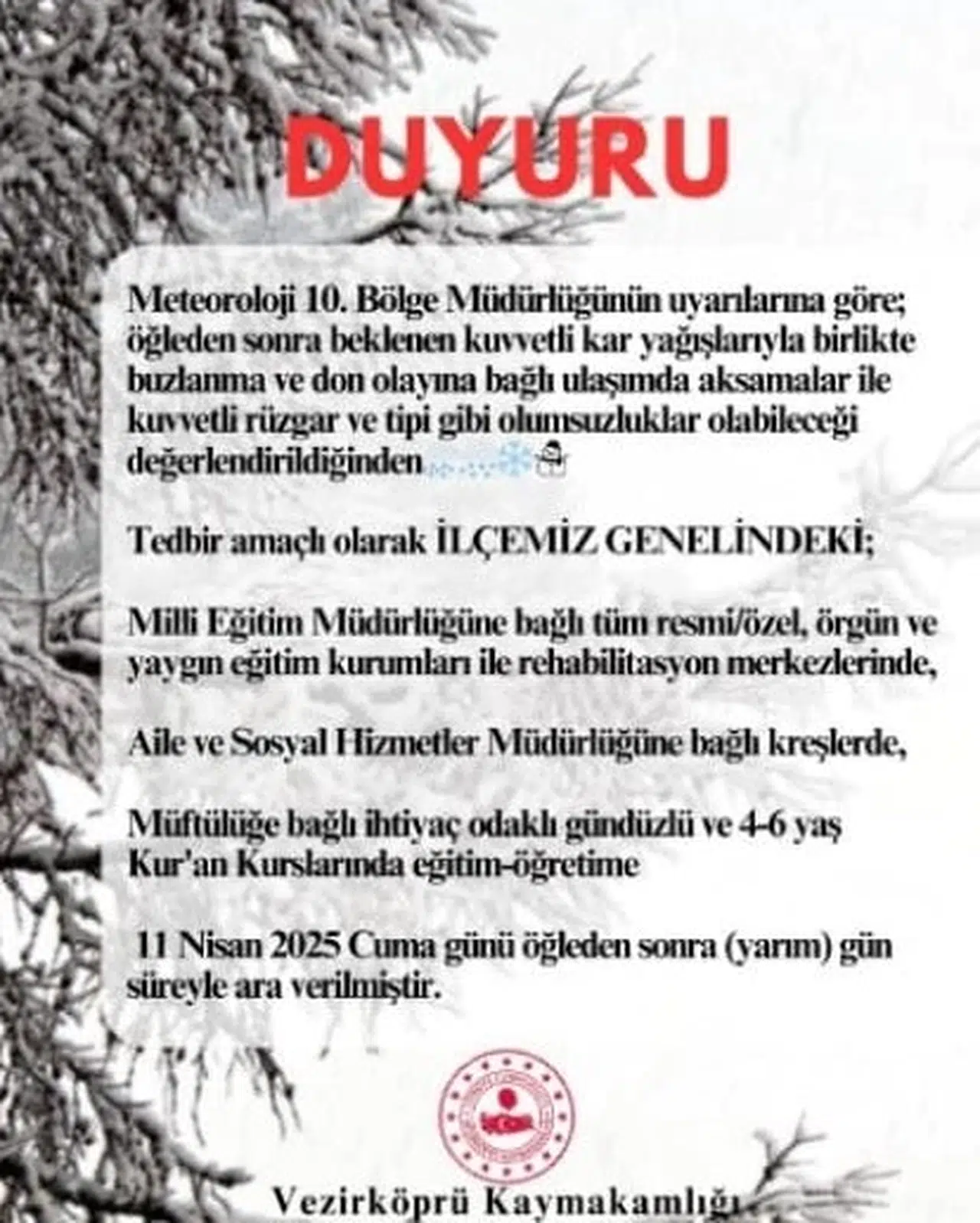 Meteoroloji 10'uncu Bölge Müdürlüğü'nün uyarılarının ardından, Vezirköprü ve Kavak kaymakamlıkları, olumsuz hava koşulları sebebiyle ilçede tedbir amaçlı eğitime ara verildiğini duyurdu. Yapılan açıklamalarda, cuma günü öğleden sonra başlaması beklenen yoğun kar yağışıyla buzlanma, don ve kuvvetli rüzgar nedeniyle ulaşımda aksamalar yaşanabileceği belirtildi. Açıklamada ayrıca, "İlçe genelinde; Milli Eğitim Müdürlüğü’ne bağlı tüm resmi/özel, örgün ve yaygın eğitim kurumları ile rehabilitasyon merkezlerinde, Aile ve Sosyal Hizmetler Müdürlüğü’ne bağlı kreşlerde, Müftülüğe bağlı ihtiyaç odaklı gündüzlü ve 4-6 yaş Kur’an kurslarında 11 Nisan 2025 Cuma günü öğleden sonra (yarım gün) eğitim-öğretime ara verilmiştir" ifadelerine yer verildi. (DHA)