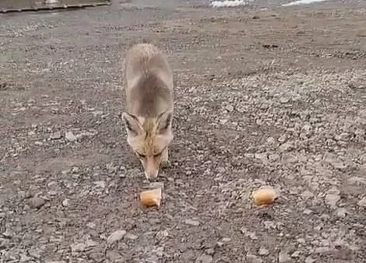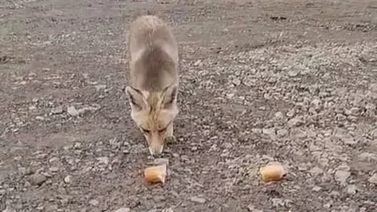Şantiye işçisi, aç kalan tilkiyi ekmekle besledi
