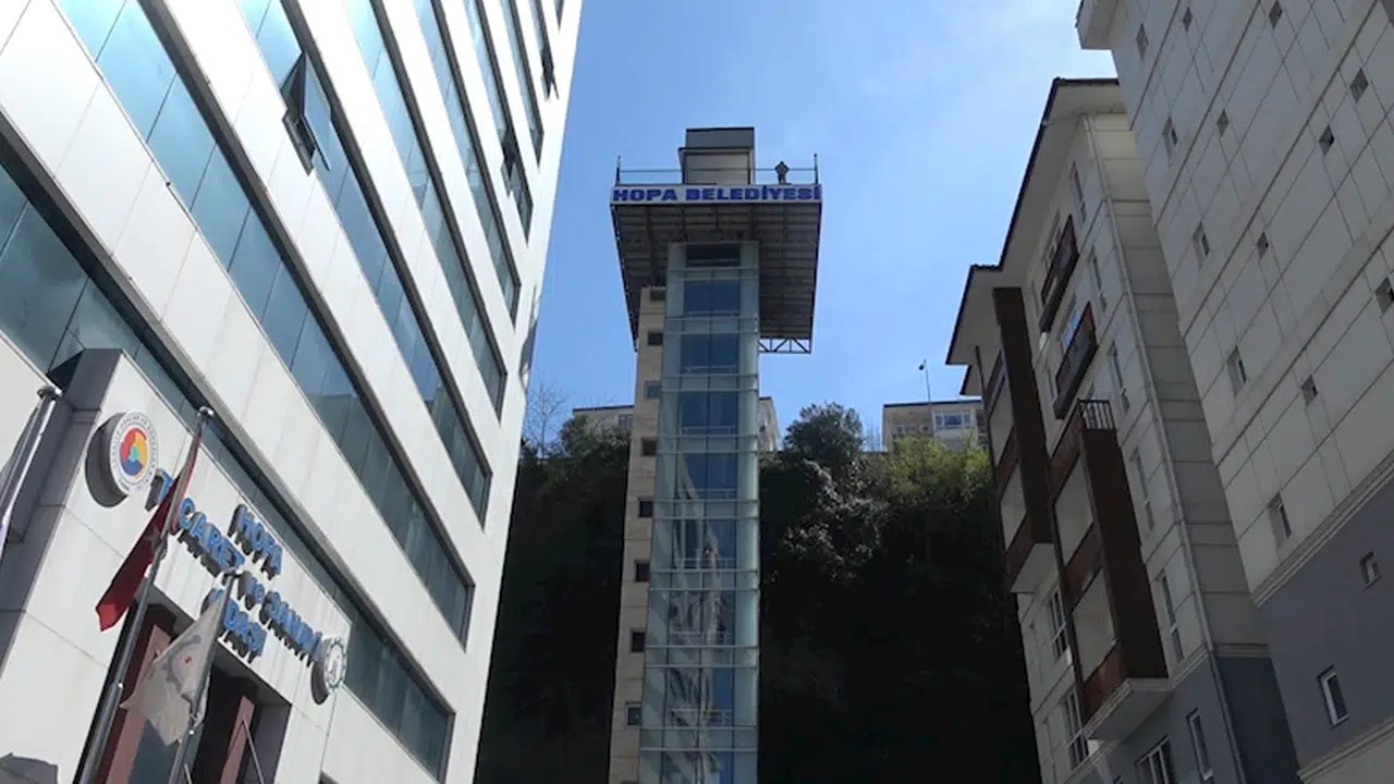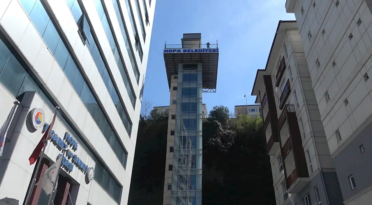 Mehmet Can PEÇE/HOPA (Artvin), (DHA)-ARTVİN'in Hopa ilçesinde Kuledibi ile Sundura mahallelerinde yaşayanlar, sarp arazideki evlerine 50 metre yüksekliğinde yapılan asansörle ulaşım sağlanıyor. 10 katlı apartman yüksekliğinde, 6 kişi kapasiteli asansör sayesinde kısa yoldan ulaşımın sağlandığı bölgedeki konutlar zamanla değer kazandı.