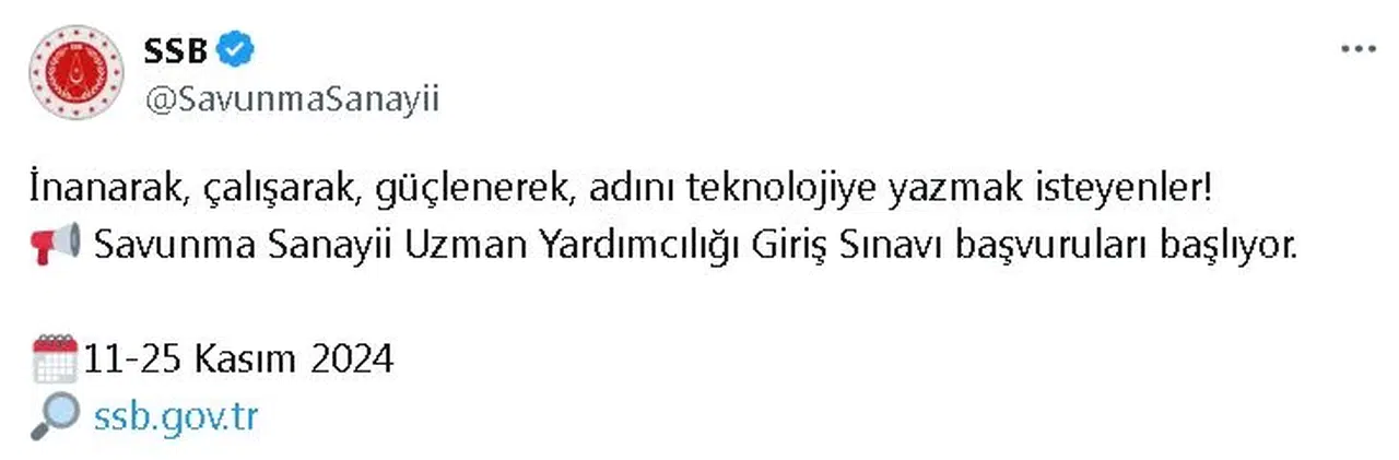 ANKARA, (DHA)- SAVUNMA Sanayii Başkanlığı (SSB), Savunma Sanayii Uzman Yardımcılığı Giriş Sınavı başvurularının başladığını açıkladı.