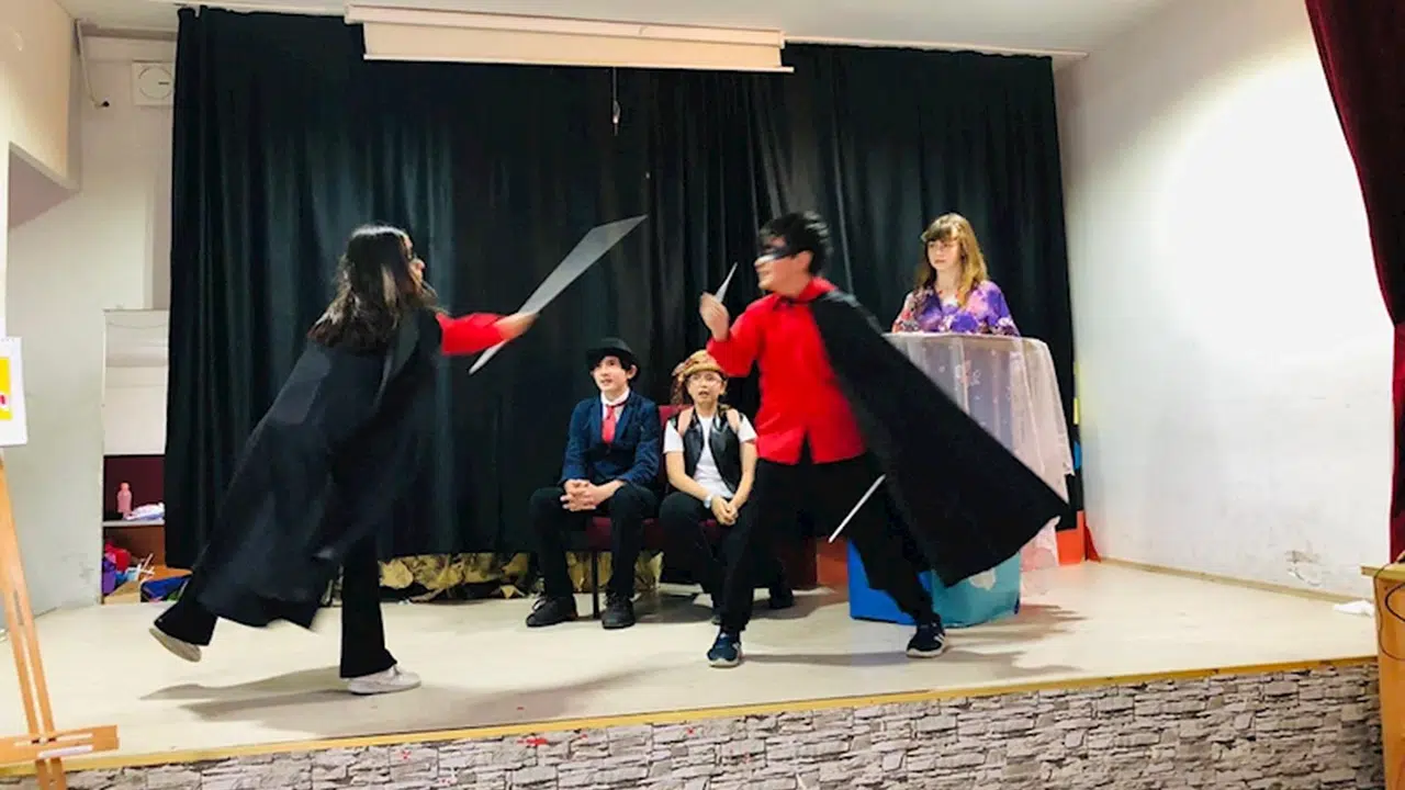Sosyal bilgiler öğretmeni Harun Tırpancı tarafından verilen tiyatro eğitiminin ardından öğrenciler, yıl sonu gösterisinde okulun salonunda gösterilerini sundu.