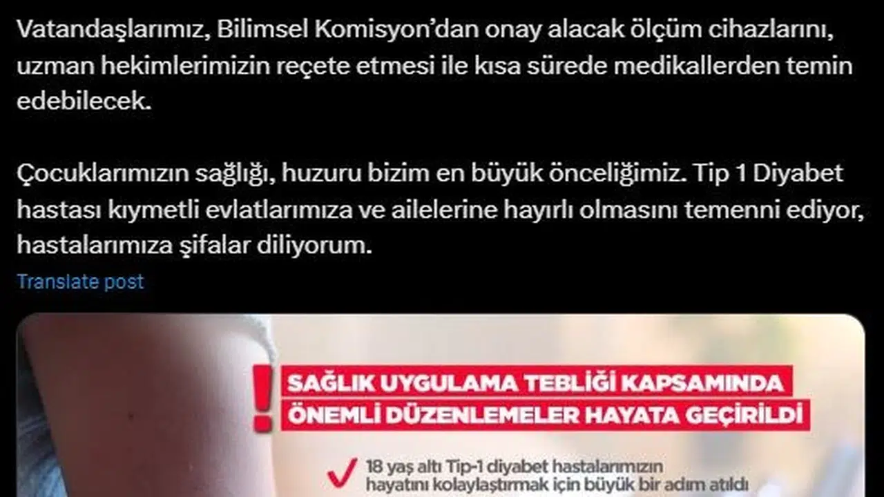 SGK'nın Sağlık Uygulama Tebliği'ne yönelik değişikliği, Resmi Gazete'nin bugünkü sayısında yayımlandı. Çalışma ve Sosyal Güvenlik Bakanı Vedat Işıkhan, tebliğ değişikliğinin getirdiği yenilikleri sosyal medya hesabından açıkladı. Bakan Işıkhan, "Cumhurbaşkanımız Sayın Recep Tayyip Erdoğan'ın açıkladığı ve Resmi Gazete'de yayımlanan Sağlık Uygulama Tebliği ile Tip 1 Diyabet hastası evlatlarımız için önemli bir iyileştirmeyi hayata geçirdik. 18 yaş altı Tip 1 Diyabet hastası çocuklarımızın kan şekeri takibini yapabilmek için ihtiyaç duydukları 'Sürekli Cilt Altı Glukoz İzlem Sistemi' Sosyal Güvenlik Kurumumuz tarafından geri ödeme listesine dahil edilmiştir. Vatandaşlarımız, Bilimsel Komisyon'dan onay alacak ölçüm cihazlarını, uzman hekimlerimizin reçete etmesi ile kısa sürede medikallerden temin edebilecek. Çocuklarımızın sağlığı, huzuru bizim en büyük önceliğimiz. Tip 1 Diyabet hastası kıymetli evlatlarımıza ve ailelerine hayırlı olmasını temenni ediyor, hastalarımıza şifalar diliyorum" ifadelerini kullandı.